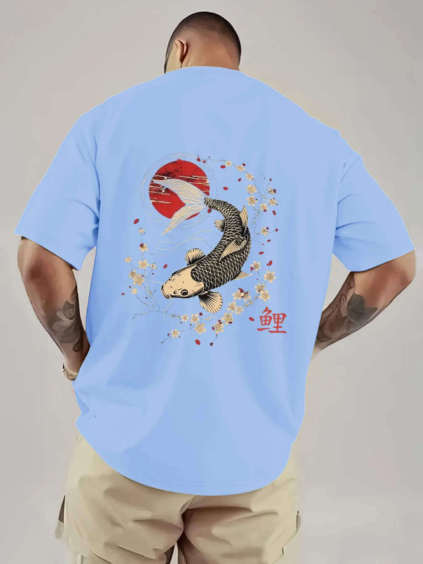 Japanese Koi and Cherry Blossom Print Men's T-Shirt, Breathable Heavyweight Short Sleeve, Streetwear for Music Festivals and Daily Wear