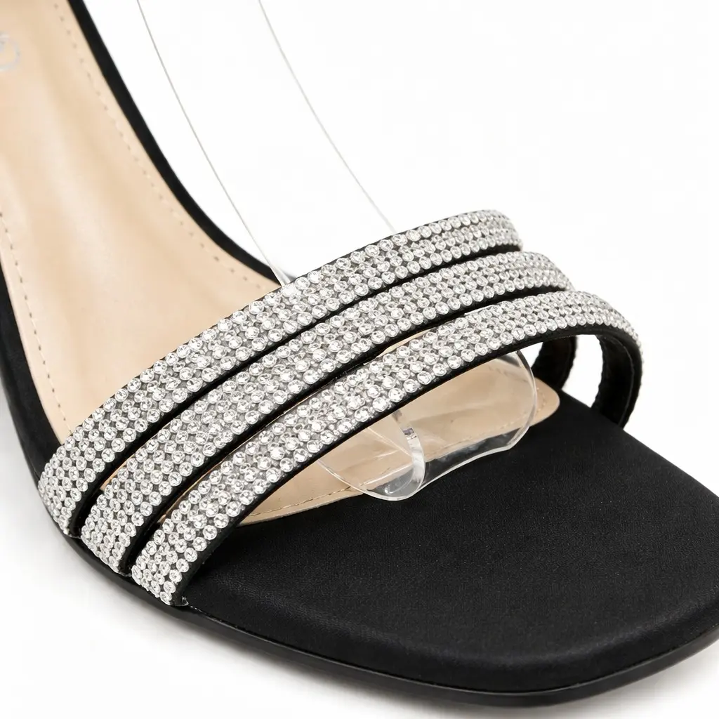 Rhinestone Strap Block Heel Sandals – Black
