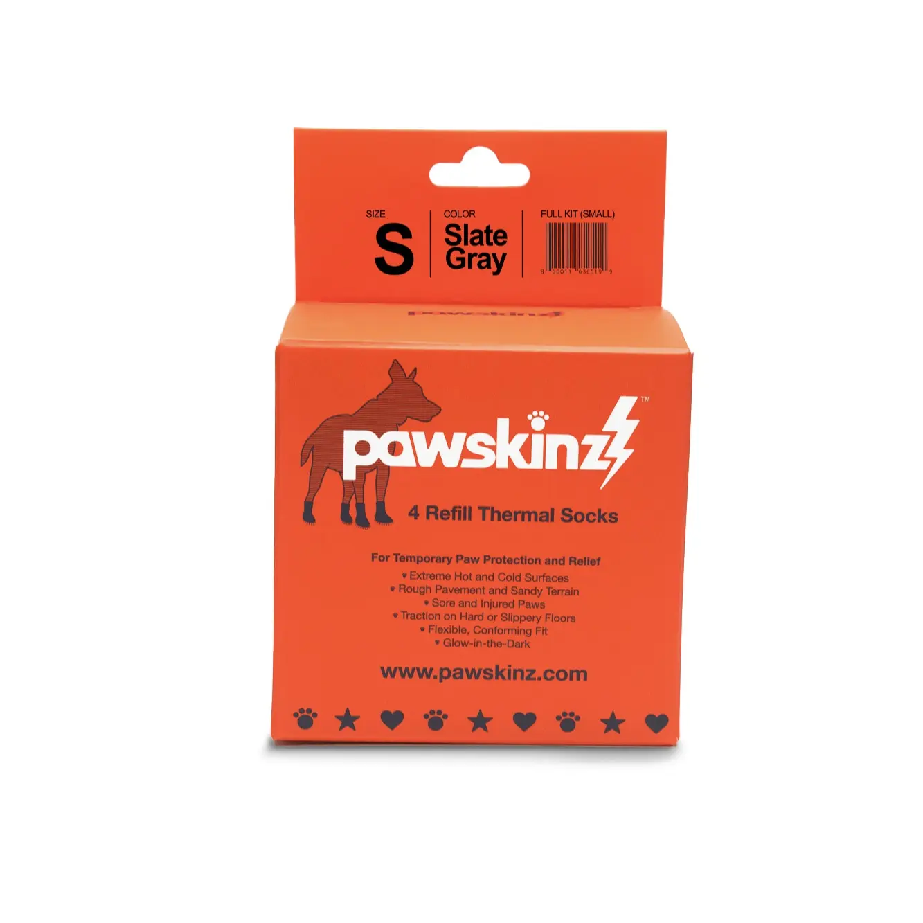 ("Easy On" Applicator NOT included). The Pawskinz refill kit provides four single hybrid thermal paw protectors to ensure your canine always has short-term paw protection. These patented, glow-in-the-dark socks are designed to be rotated in as needed (Applicator needed). Pawskinz shields the paws from extreme hot or cold surfaces, rough pavement, and sandy terrain. They provide essential traction on hard surfaces and offer a comfortable, flexible fit with a built-in claw garage. Each Pawskinz is waterproof, chemical-proof, biodegradable, and recyclable. This refill kit includes 4 single hybrid thermal socks only; the applicator ring and carrying pouch are not included. Small Paw Size: Paw Width- 1.5"-2" x Paw Length- 2"-2.5"