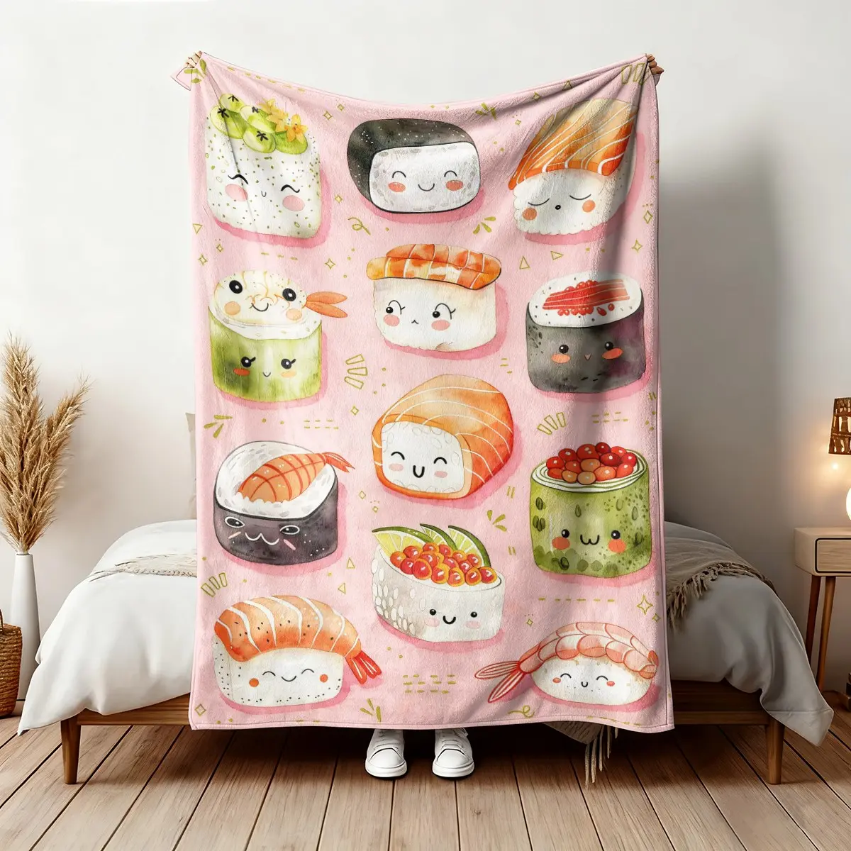 Cute Sushi Pattern Flannel Blanket, Soft Skin-Friendly Warm, Easy to Store, Multi-Scene Home Office Travel Throw, Suitable for Sushi Lovers