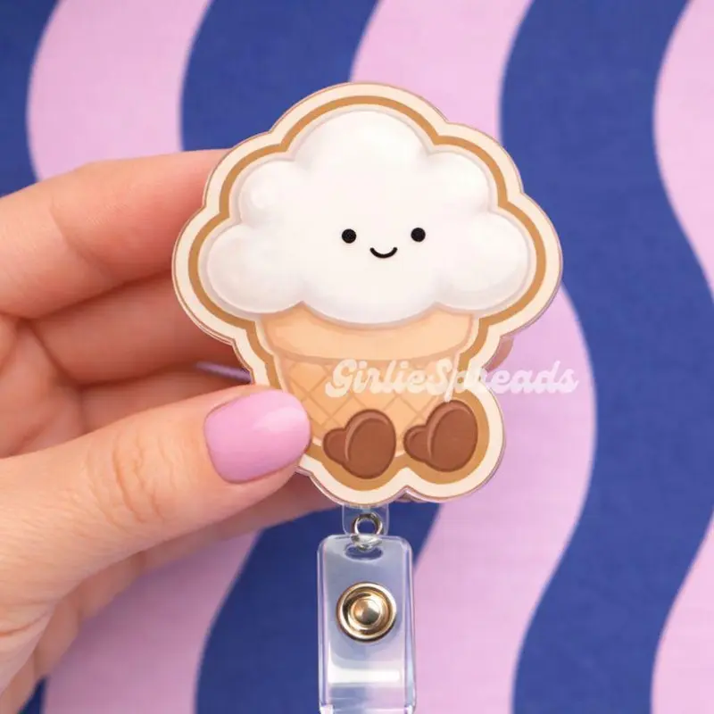 Ice Cream Cloud Badge Reel – Kawaii Waffle Cone Acrylic ID Holder – Pastel Retractable Clip