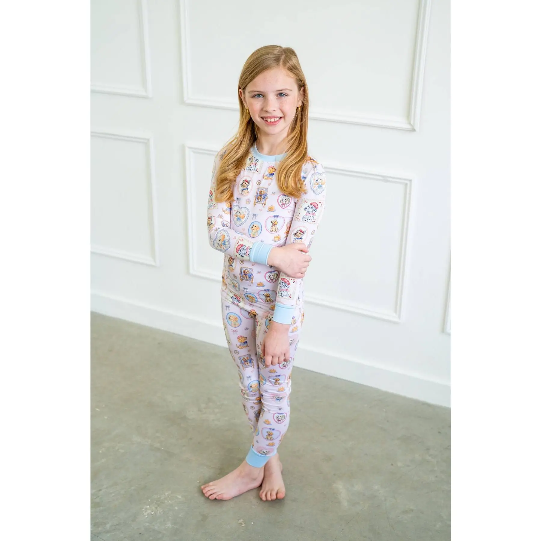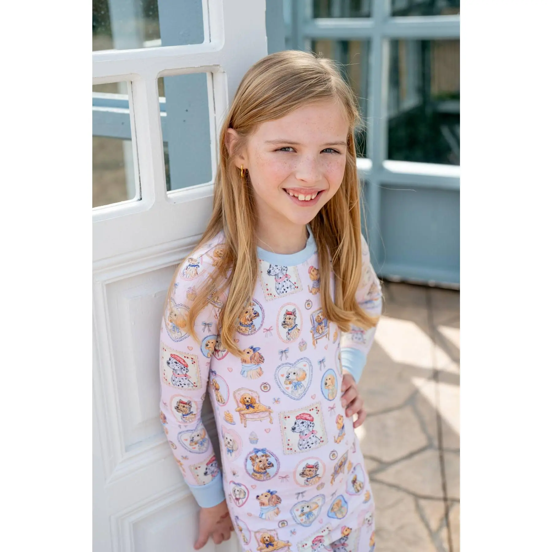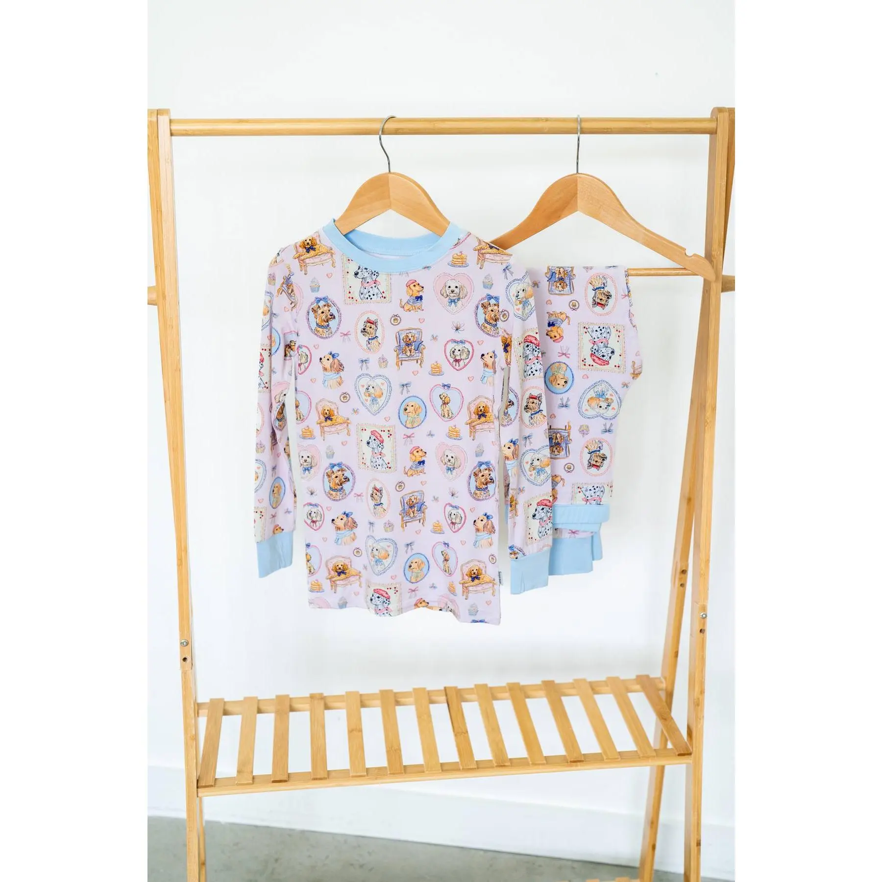 Our Parisian Pups Two-Piece Pajamas are sprinkled with the sweetest coquette details — doodles, goldens, yorkies, and more dressed in tiny Parisian hats, perched on café chairs, tucked inside vintage frames, and surrounded by dainty cupcakes. Set on the softest light pink background with dreamy light blue cuffs, it feels playful, girly, and perfectly charming.
