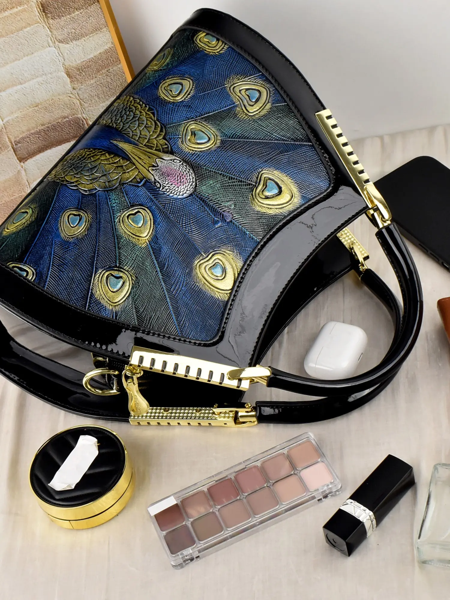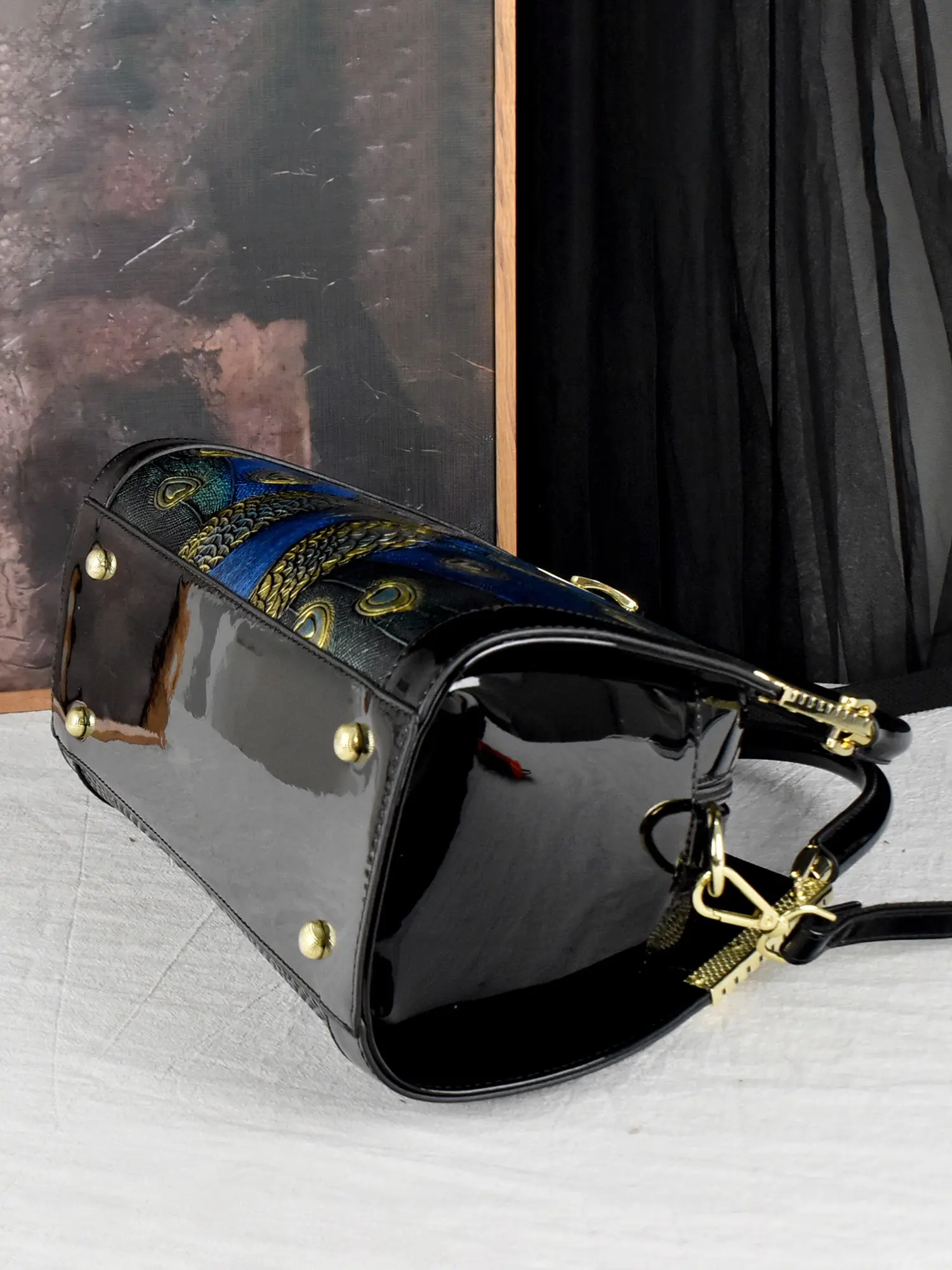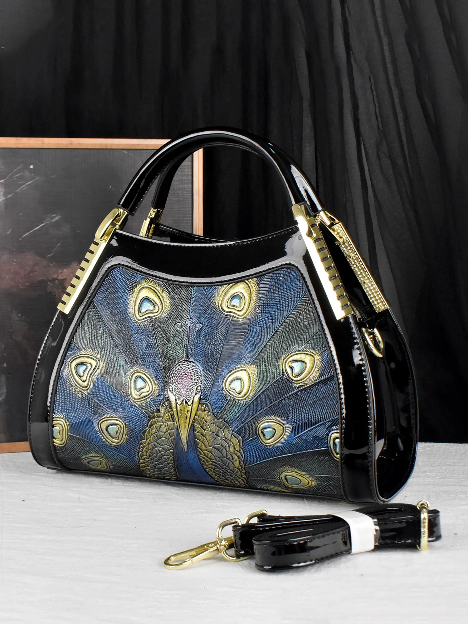 Designer Peacock Design Women's Handbag, Elegant Feather Pattern Boston Bag, PU Material, All Seasons Fashion Accessory