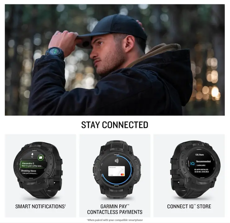 ·CONNECTED SMART FEATURES. Stay connected with smart notifications, incident detection during select activities, Assistance alerts, and Garmin Pay contactless payments when paired with a compatible smartphone.