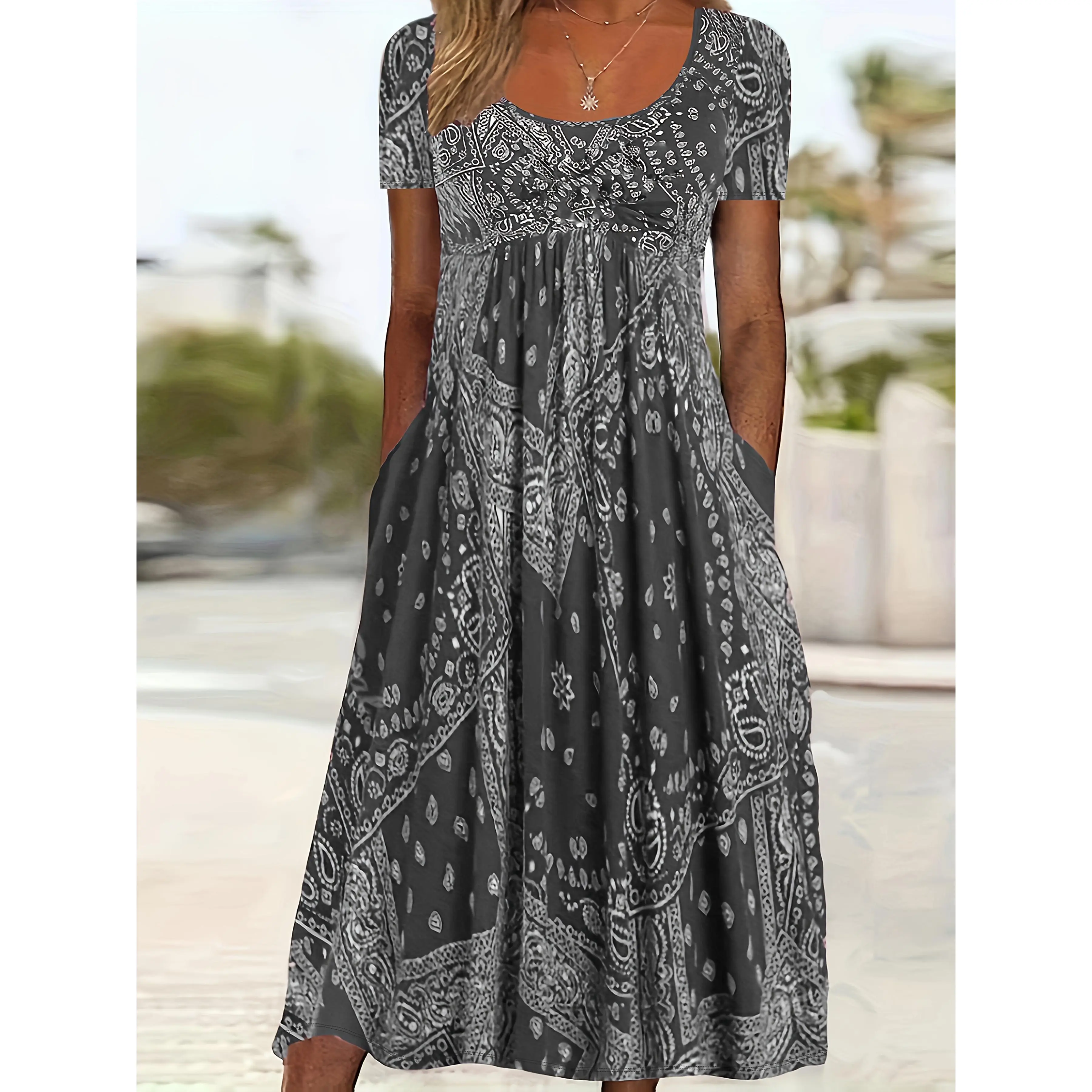 Material: PolyesterComposition: 95% Polyester,5% ElastaneFit Type: AOccasion: Weekend CasualStyle: CasualOperation Instruction: machine washable, no dry cleanSeason: SummerType: Fit and FlarePlacket Type: PulloversFabric: Medium StretchSilhouette: Fit and FlareDresses Length: Long lengthSheer: NoPattern: Random PrintDetails: Ruched BustHem Shaped: FlaredChest Pad: NoSleeve Type: Regular SleeveSleeve Length: Short SleeveBelt: NoLength: Long lengthPrinting Type: Random PrintingWeaving Method: Knit FabricCollar Style: Crew NeckLining Ingredients: 95% Polyester,5% ElastaneItem ID: XD4186398Origin: Guangdong,China
