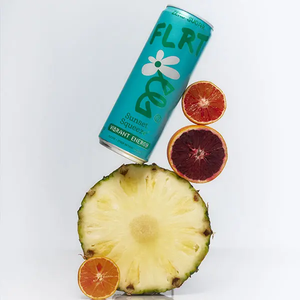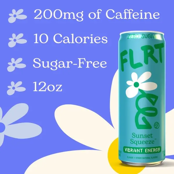 ·VIBRANT ENERGY | FLRT energy is designed with you in mind. Formulated to be sugar-free, 10 calories, and gluten-free. FLRT offers a variety of zero sugar, energy drinks with bold, fun fruity flavors packed with 200mg of caffeine. Meet your sunset state of mind, FLRT Sunset Squeeze is bold, bright, and refreshing. One sip and you’re on island time.