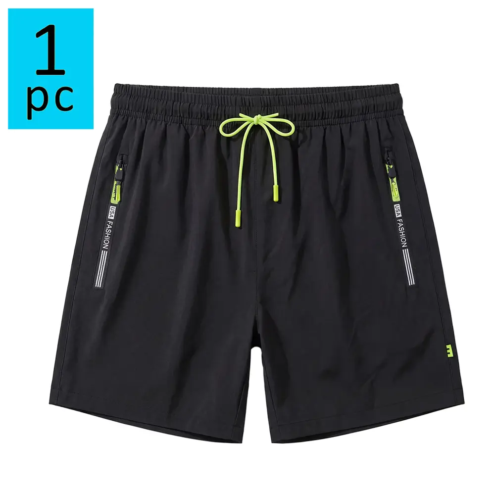 Men’s summer shorts are lightweight, breathable, quick-drying, and feature zippered pockets and a fluorescent green drawstring. Solid-color casual sports running shorts—mid-length for jogging and outdoor hiking—suitable for everyday fitness training.