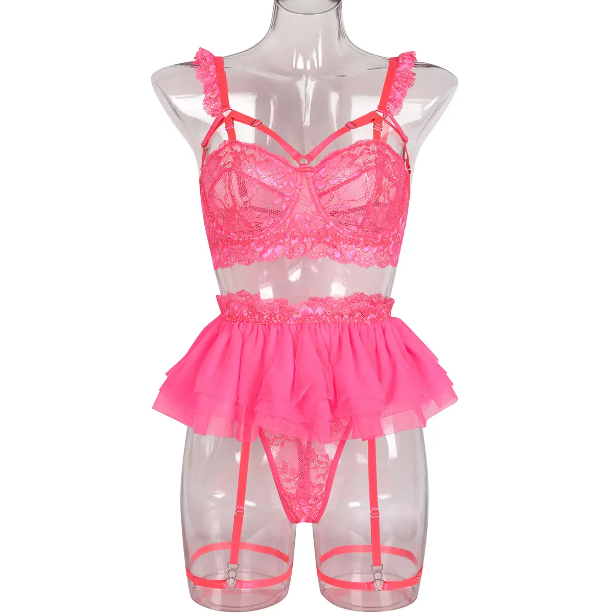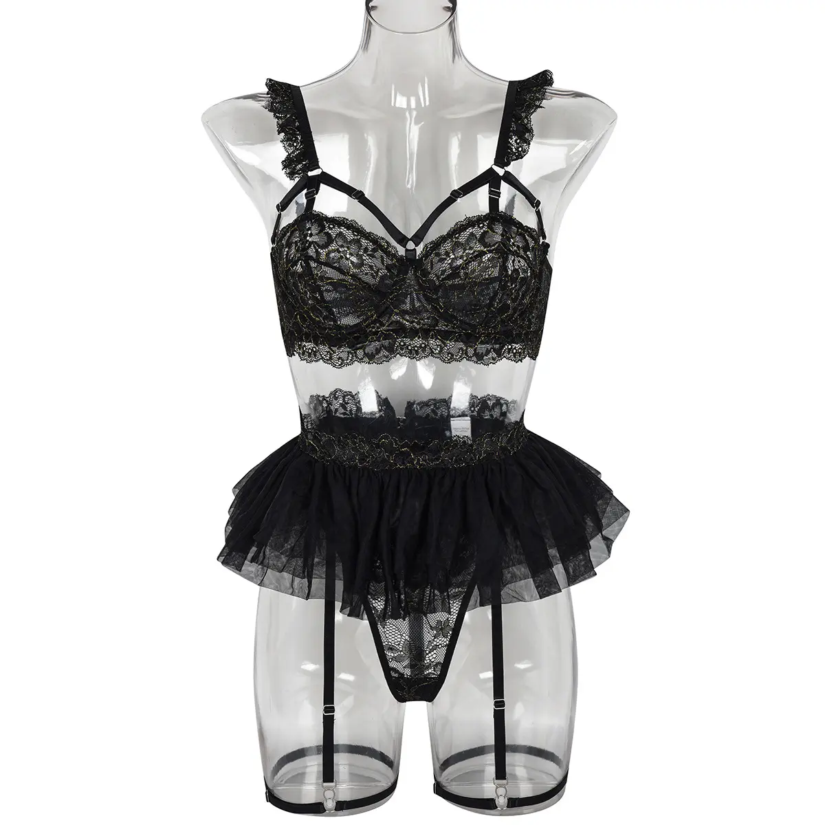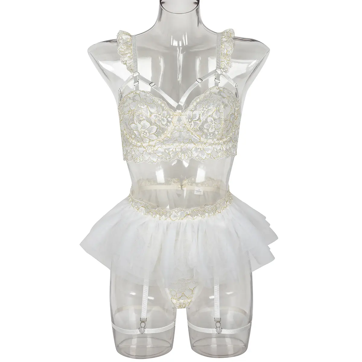 White Wedding Lace Stitching Suit Three-Layer Folding Puffy Three-Dimensional Mesh Three-Piece Set Womenswear Lingerie Basic Minimalist