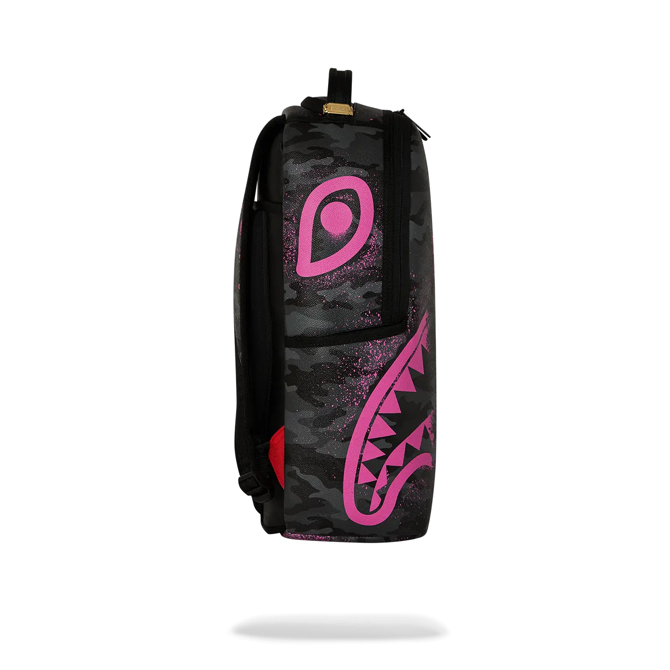 Dimensions: 18" x 6" x 11.5" • Front zipper pocket • Side pockets • Zippered Stash pocket • Separate velour sunglass compartment • Ergonomic mesh back padding • Adjustable Straps for custom sizing • Gold zippers with metal hardware • Metal "Sprayground Authentic" badge • Slide through back sleeve connects to carry-on luggage to free your hands