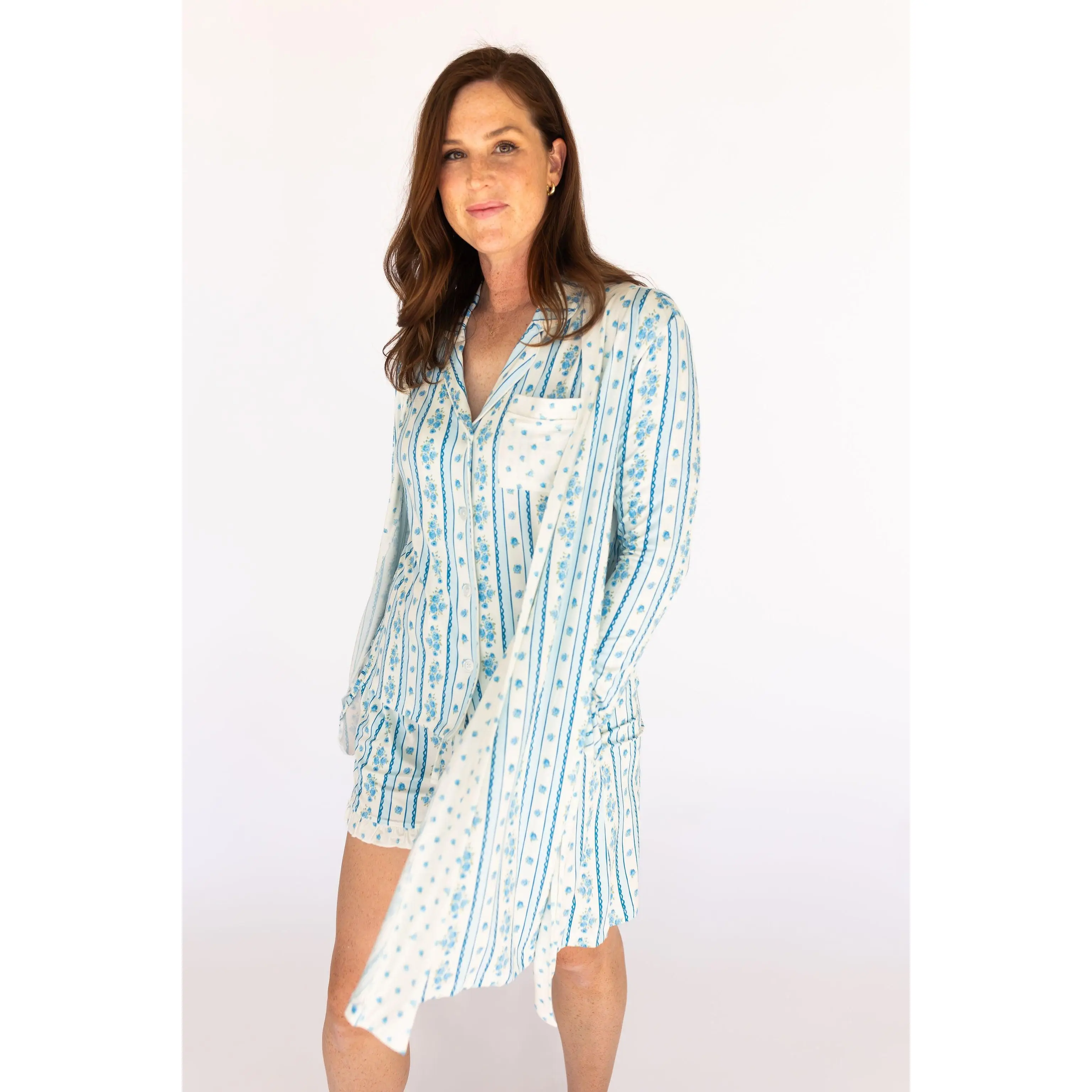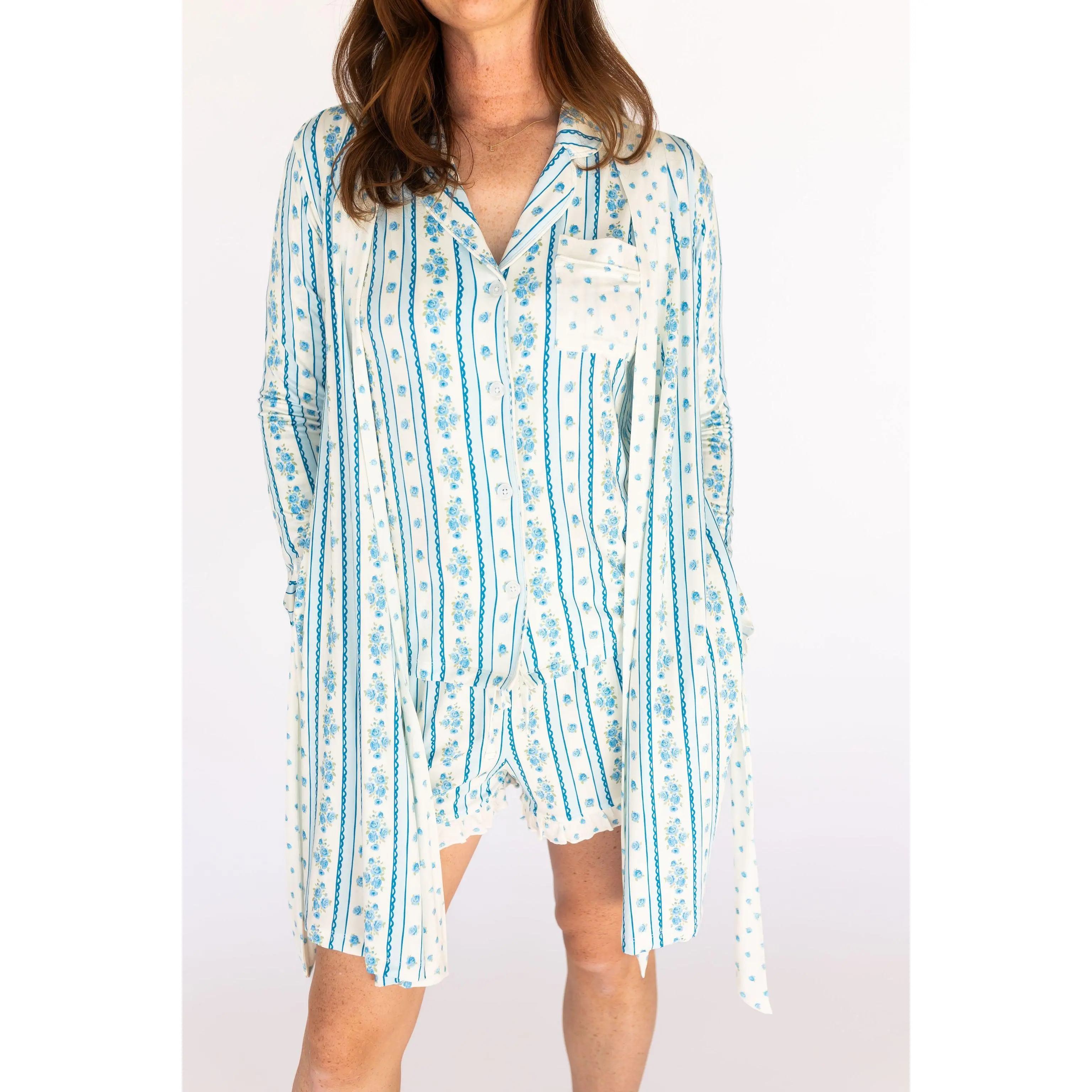 For the mom who appreciates the beauty in the details. Meet Forever Blooming, a vintage-inspired print that feels like it was made for her. This dreamy cream base is adorned with stripes of blue, delicate scalloped details, and blue roses. It's romantic, it's nostalgic, and it's perfect for matching with your mini.