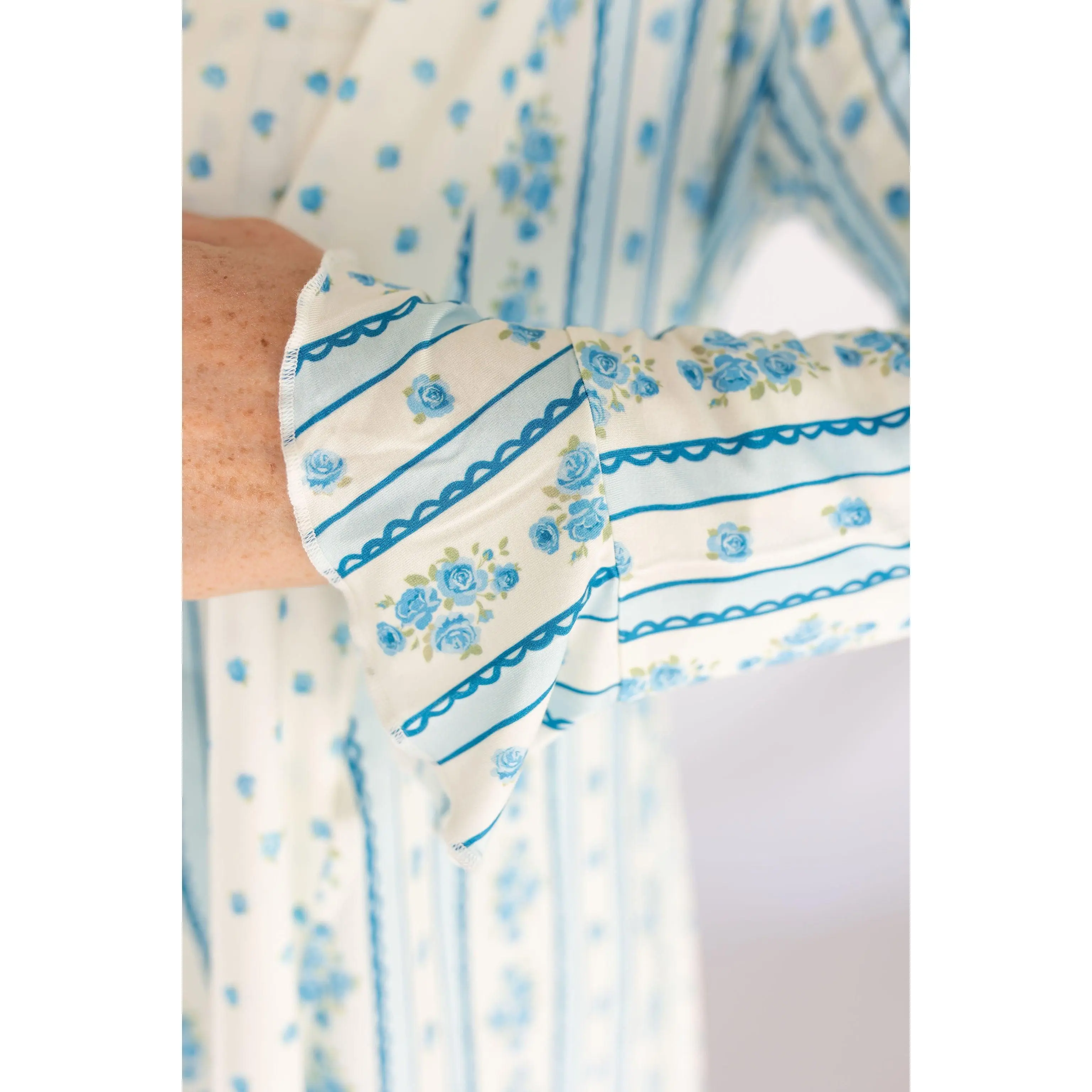 ·Cream base with blue stripe details, scalloped accents, and blue roses