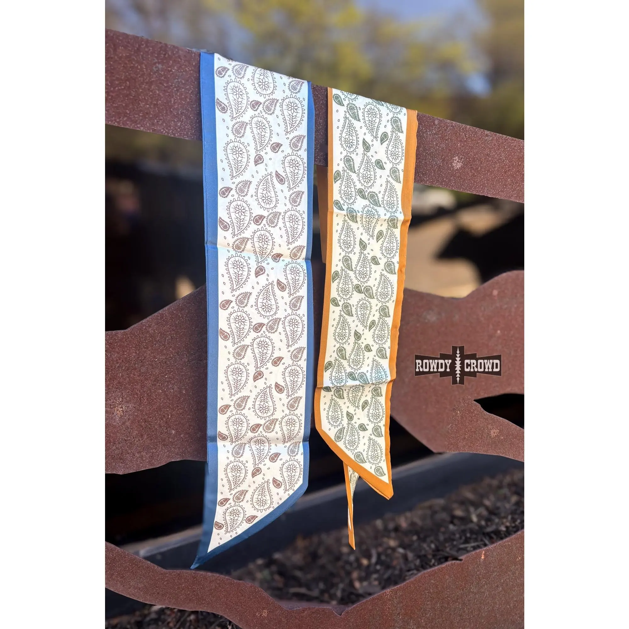 Pony up, it’s time to accessorize. The Pony Up Paisley Twillies bring classic western paisley to life with bold border colors in Blue and Mustard. Lightweight and easy to style, they’re made to add a little punch to any outfit- however you wear ’em.
