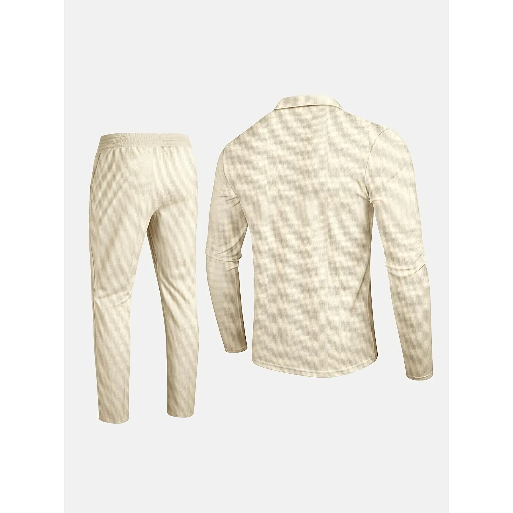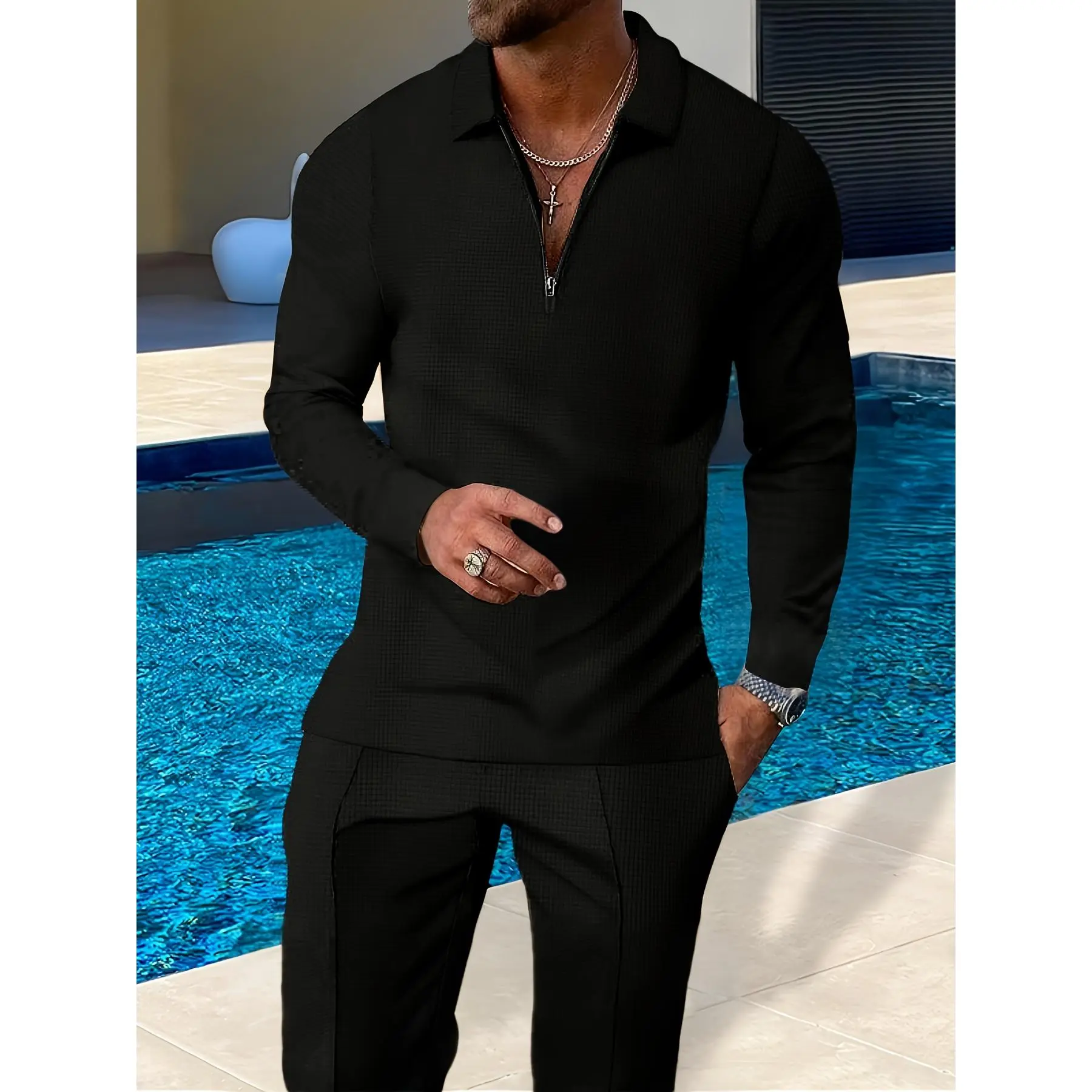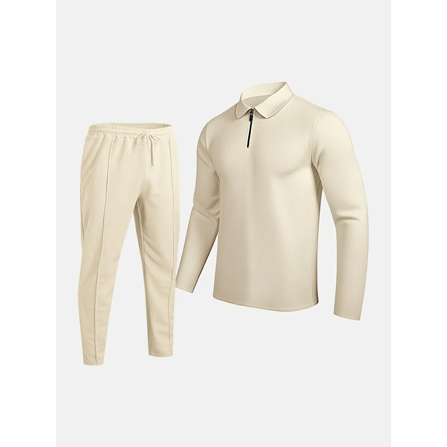 Summer Men's Casual Suit: Solid Color Long-Sleeve Top and Pants, Half-Zip Turn-Down Collar Men's Suit, Lightweight and Breathable Street Casual Pleated Suit