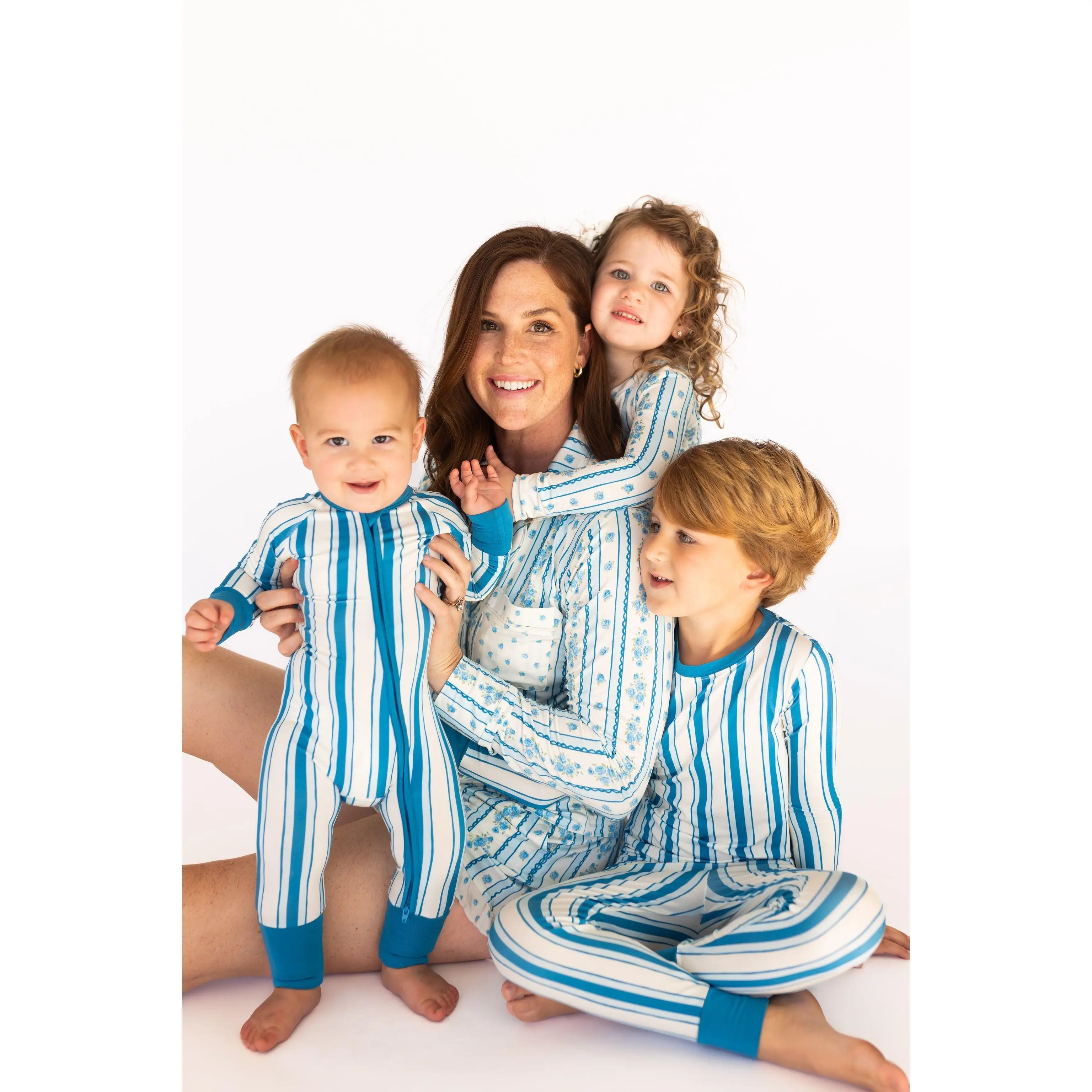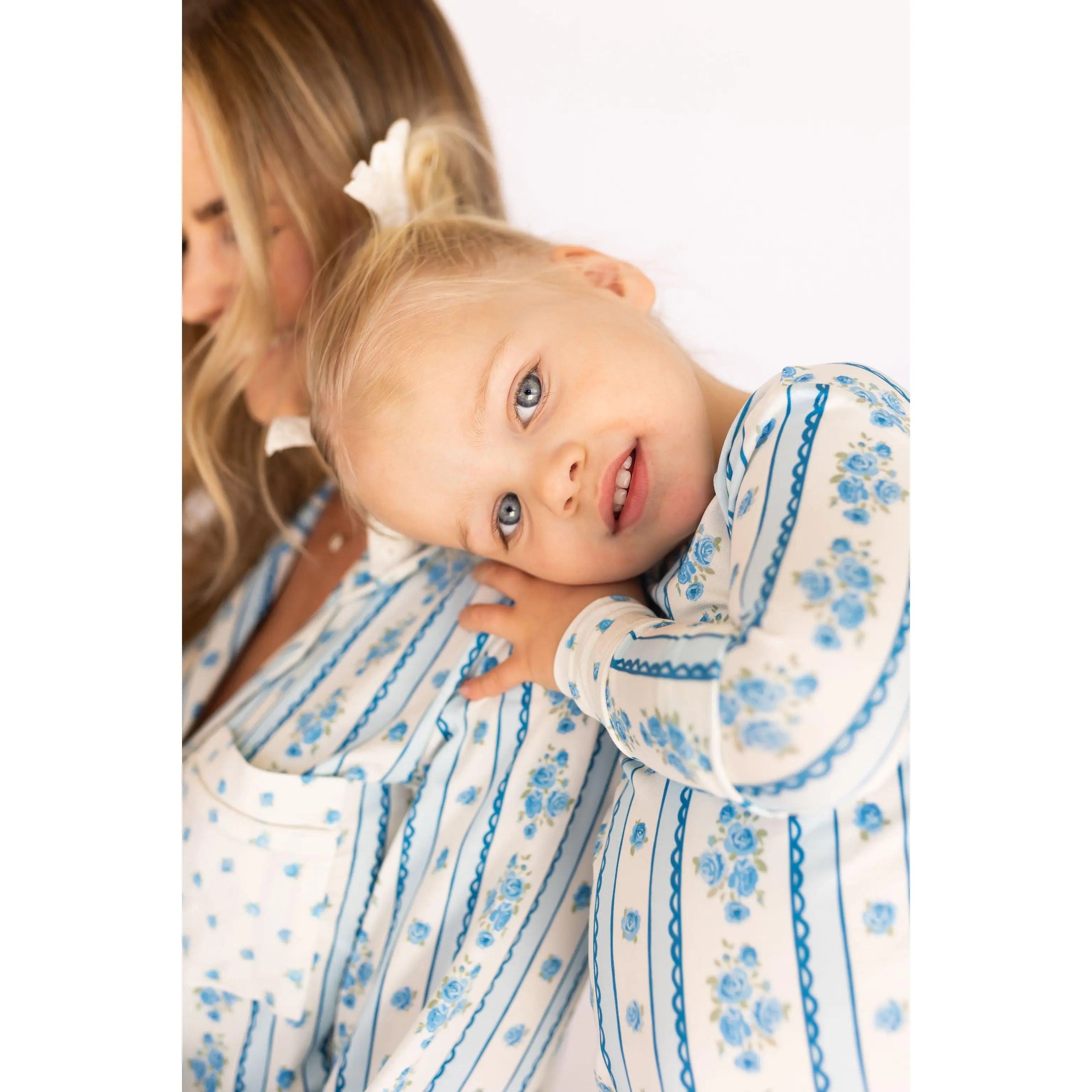 For the mom who appreciates the beauty in the details. Meet Forever Blooming, a vintage-inspired print that feels like it was made for her. This dreamy cream base is adorned with stripes of blue, delicate scalloped details, and blue roses. It's romantic, it's nostalgic, and it's perfect for matching with your mini.
