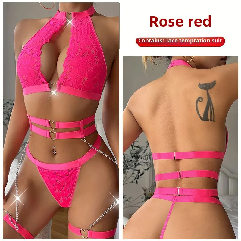 lingerie sets for women sexy [aceLingerie Set, Sexy Pink] 4pcs SexyLace Lingerie Set -Women's KnitFabric Underwear with Garter Belt andThigh Band, Hollow Spaghetti StrapDesign, 95% Polyester 5% Elastane,All-Season Solid Color, 90g/m Womenswear Comfort