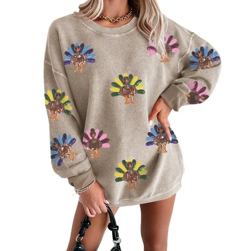 🍂Thanksgiving Style with Comfort/This women's Thanksgiving sweatshirt features a printed design with a turkey pattern, making it perfect for the season.This corded baggy design offers a relaxed fit, ideal for casual wear.The long sleeve and round neck style ensure comfort throughout the day.Ideal for those seeking a cozy, laid-back look./🎨Casual and Stylish/This sweatshirt is a versatile addition to your wardrobe.The turkey graphic adds a festive touch, while the corded detail enhances its casual appeal.Pair it with jeans or leggings for a complete outfit.It's a go-to piece for everyday wear, ensuring you stay stylish and comfortable./🛍️Comfortable Wear/Designed for comfort, this sweatshirt is perfect for Thanksgiving or any casual occasion. The baggy fit and long sleeves provide ample space for movement. Enjoy the convenience of a round neck and corded details. This top is a must-have for your casual collection.