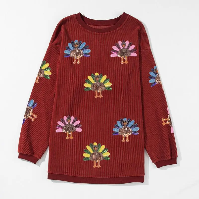Women's Thanksgiving Sweatshirt with Sequin Turkey Graphic Corded Baggy Long Sleeve Winteroutfit Round Neck Casual Tops for Comfortable Wear