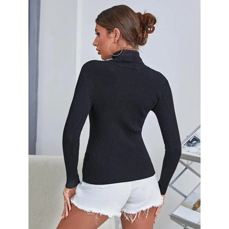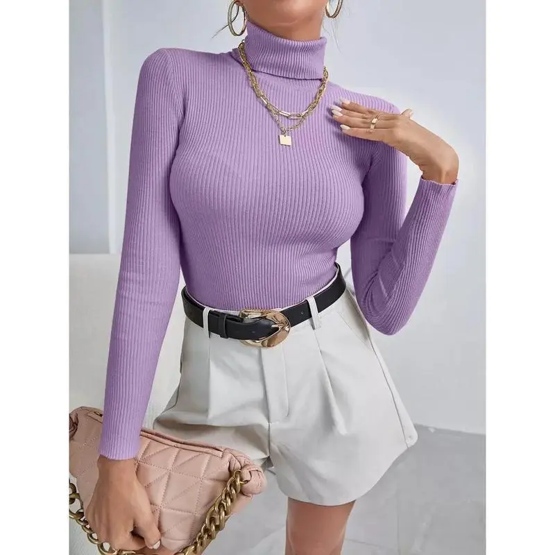 Solid Color Turtleneck Ribbed Knit Sweater Long Sleeve Top Knit Pullover Autumn Winter Outfit
