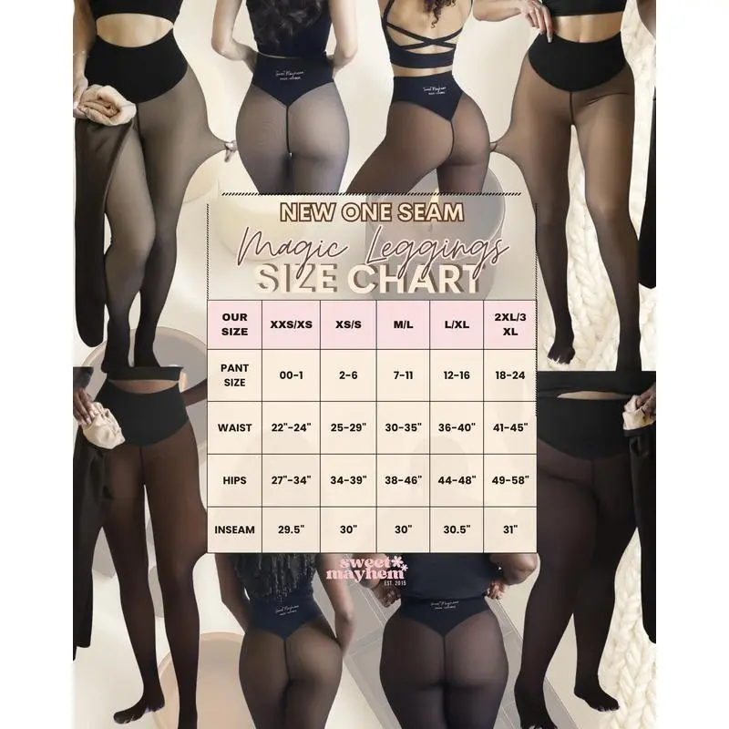 THE ORIGINAL MAGIC LEGGINGS/THE FIRST & ONLY FLEECE LINED LEGGINGS WITH A COMPRESSION BAND THAT SNATCHES YOUR WAIST!/✨Stay Warm and Stylish!✨/Do not fall for cheap copies!These viral magic leggings are the real deal.Sold over 200,000 pairs, they mimic skin with 4 fleece-lined shades.Unlike knockoffs, we offer multiple seam options, sizes and shades.Perfect for both short and tall girls, fitting up to 6'2".Elevate your fall & winter wardrobe with these must-haves./Cozy Comfort/• Cozy fleece lining keeps you warm.• Stretchy material hugs your curves.• Looks like pantyhose but feels like leggings.• Pair with oversized sweaters for a chic look./Sizing Guide/Please see the size chart below to choose the size that will fit you best!If you're in between sizes, we recommend sizing up for a more comfortable fit!Feel free to message us for help choosing a size!:)/Material & Care/🧶38.9% Nylon, 14.9% Spandex, 46.2% Polyester.🧺Always flip inside out when washing.🧼Hand wash or gentle cycle.☀️Hang dry or lowest heat tumble dry.❄️Cold/warm water only; never hot!/Shipping & Details/📦Ships from California, USA.📍Located in San Jose, CA.🌟Extremely stretchy, high-waisted design.🌟Not an overseas brand.