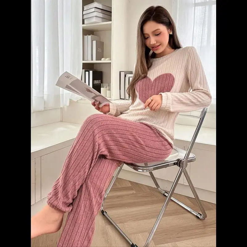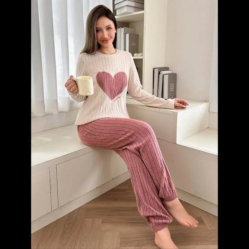 [Heart Pattern]: Featuring a unique heart pattern, this sleepwear set adds a cheerful touch to your relaxation time. /[Two-Piece Set]: The set includes long-sleeve top and long pants, providing complete coverage during cooler seasons. /[Spring and Fall]: Designed specifically for spring and fall, this outfit ensures warmth without sacrificing breathability. /[Loose-Fitting]: Crafted with a loose-fitting silhouette for unhindered movement, enhancing your home lounging experience. /[Soft Fabric]: Made from soft material, this two-piece set offers a gentle touch against the skin for added relaxation.