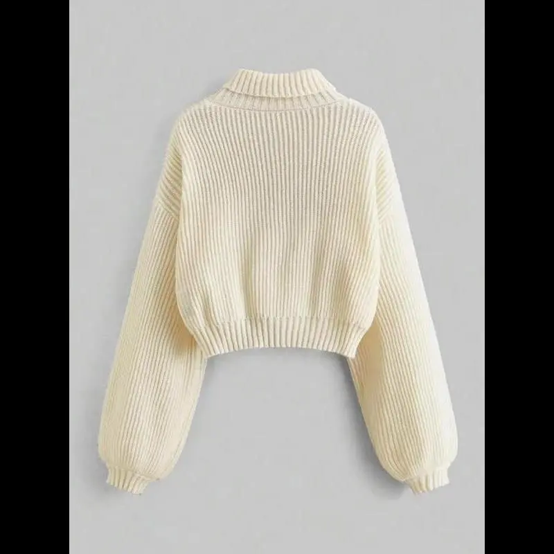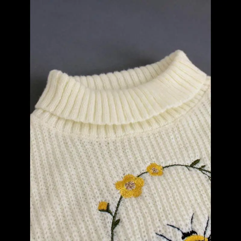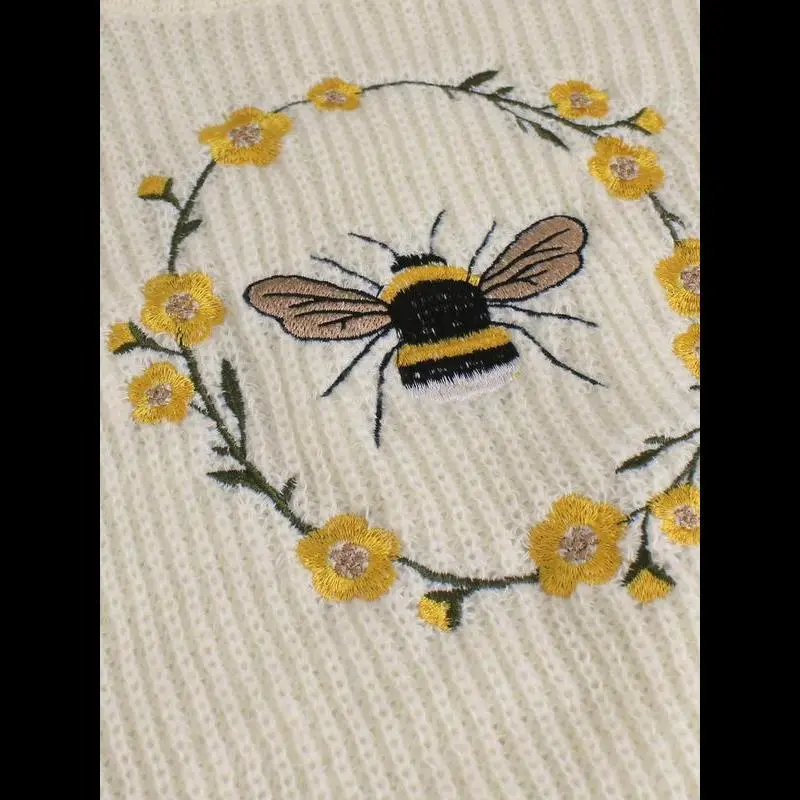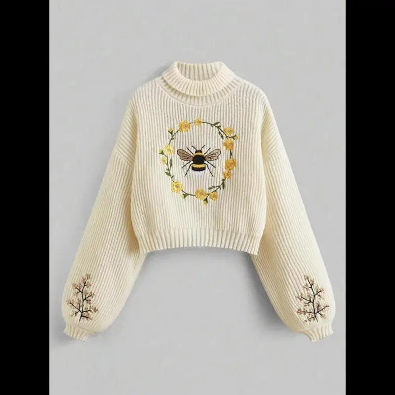 Women's Cartoon Bee Embroidery Drop Shoulder Sweater, Casual Knitting Long Sleeve High Neck Jumper for Spring & Fall, Chic Knitwear for Women, Fashion Women's Knitwear for Daily Wear, Womenswear