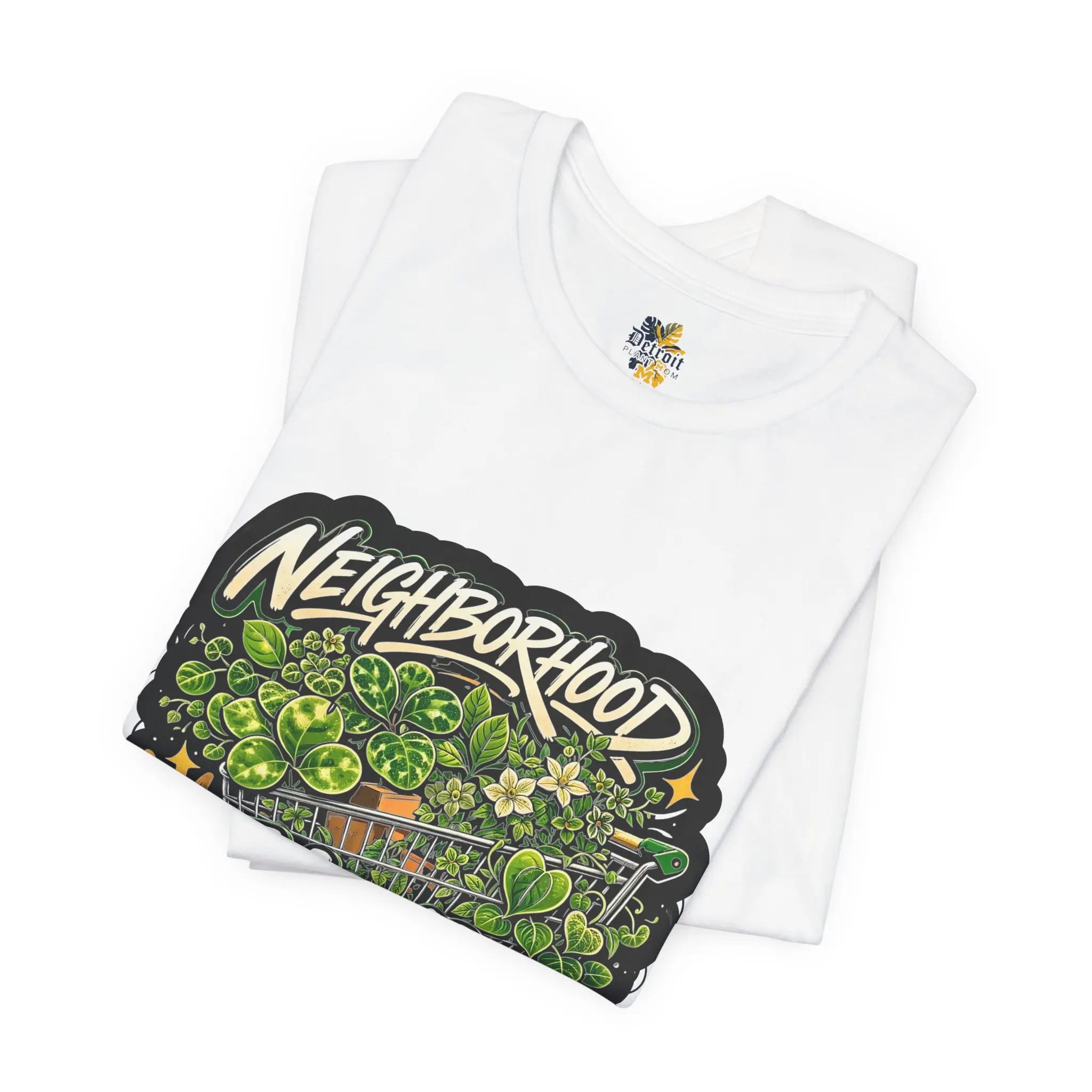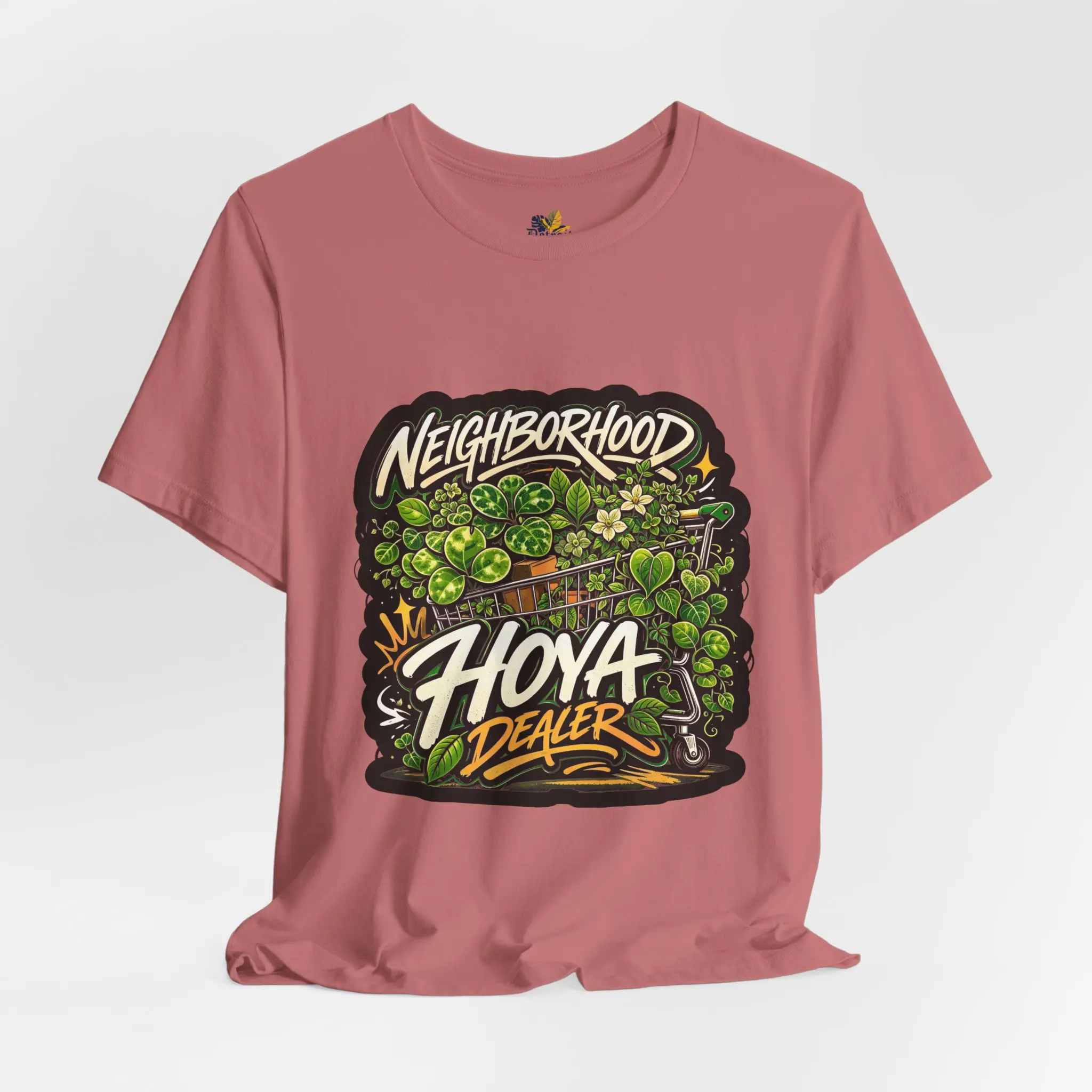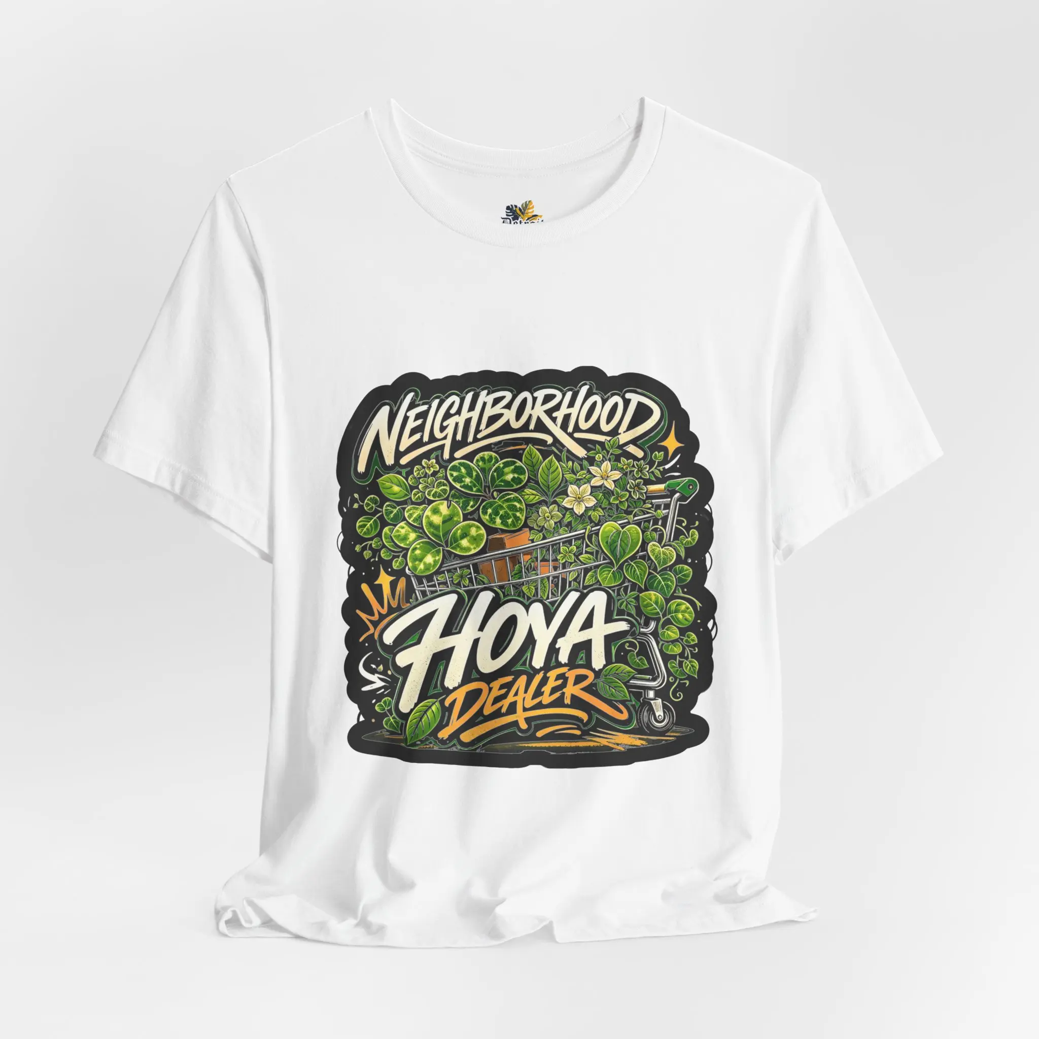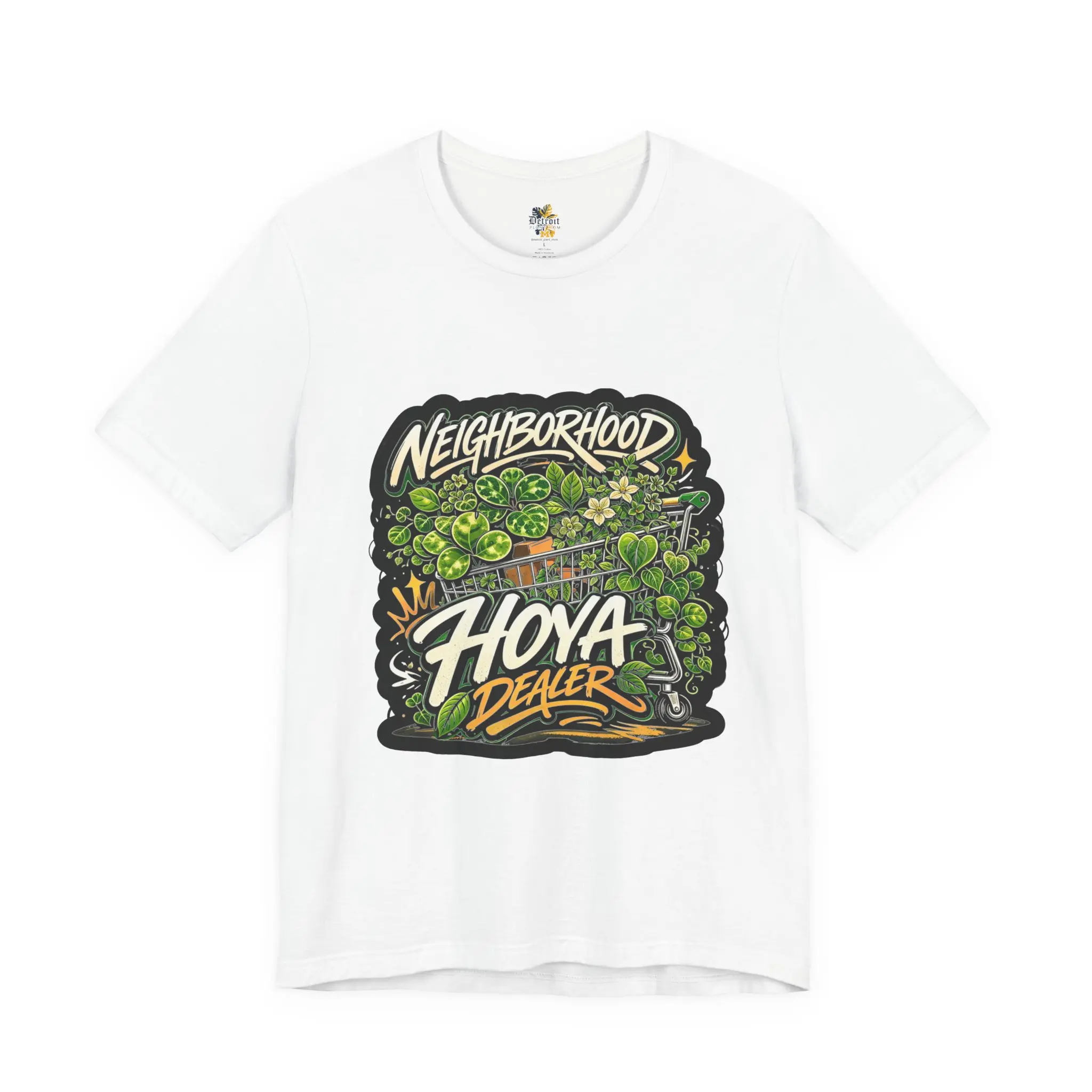 This lightweight crew-neck tee carries a bold, streetwise vibe—hand-drawn graffiti lettering and dense, leafy green illustration blend into a compact, high-contrast chest piece that reads “Neighborhood Hoya Dealer.” The soft Airlume combed and ring-spun cotton feels breathable against the skin and drapes cleanly thanks to side seams and a retail cut. Small, thoughtful details—ribbed knit collar, shoulder tape and a tear-away label—keep the fit comfortable and long-lasting. The print methods deliver crisp linework and vibrant greens that pop on the white base, making this tee an easy layering piece for casual days, campus hangs, and neighborhood strolls.