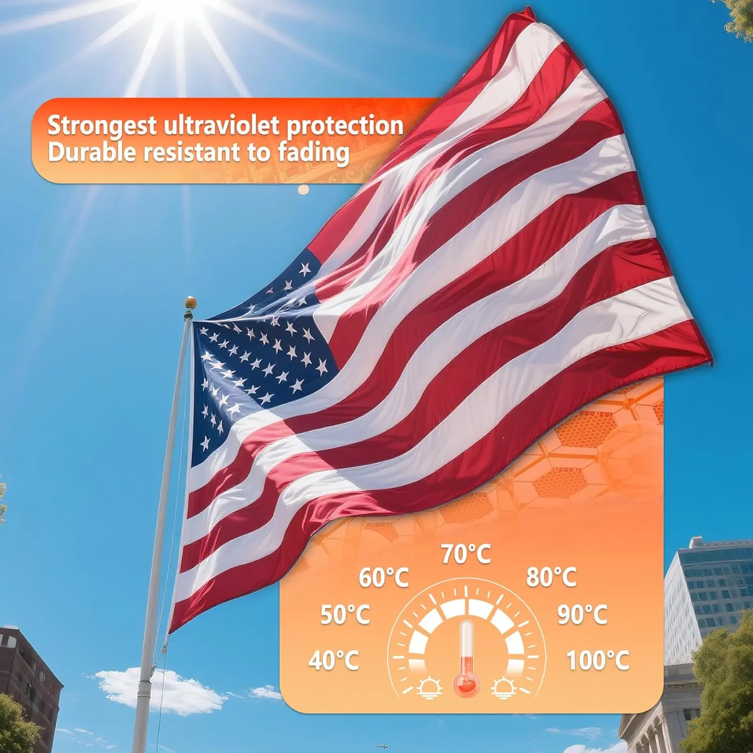 Strong stitching with strong tear resistance,this weather resistant USA flag boasts professional Four-Row Hem Stitching and full-body reinforced seams. Four-row reinforced hem stitching locks edges tight—no fraying or tearing even in 50+ mph gusts, saving you from frequent flag replacements!Stars and Stripes;4-row stitching locks edges tight Longest Lasting American Flags For Outside, so the US Flag is wind resistant.