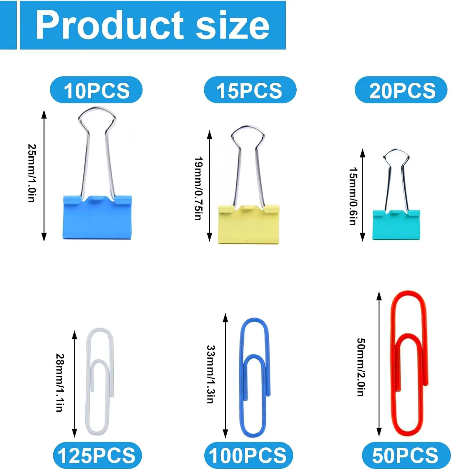 ·【Various Colors and Sizes】320pcs various sizes binder clips and paper clip set, among them color paper clips (1.1 inch * 125pcs, 1.3 inch * 100pcs, 2 inch * 50pcs), color binder clips (0.6 inch * 20pcs, 0.75 inch * 15pcs, 1 inch * 10pcs), multiple colors and multiple models to better meet your different needs, very affordable.