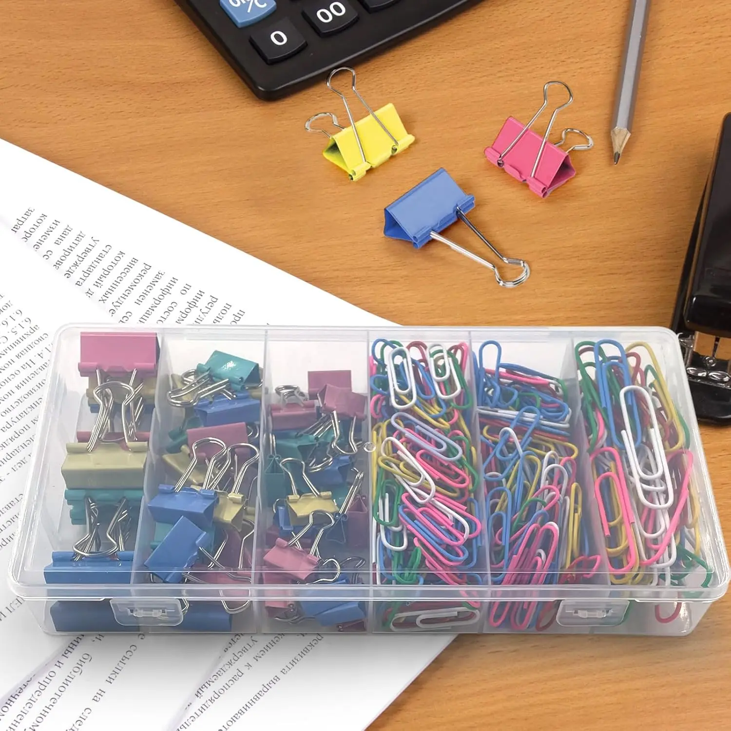 ·【Convenient Storage】 Various colors of large paper clips, medium paper clips and small paper clips, various colors of medium binder clips, small binder clips and mini binder clips are placed in a plastic container with 6 separate compartments for each size, which is easy to access, prevents loss and keeps the desktop and drawer neat and tidy.