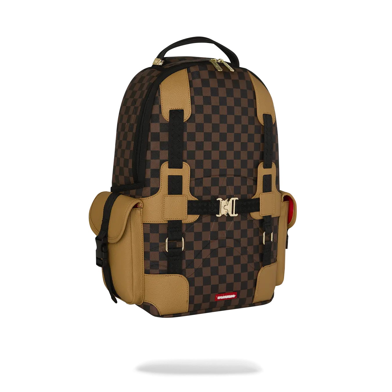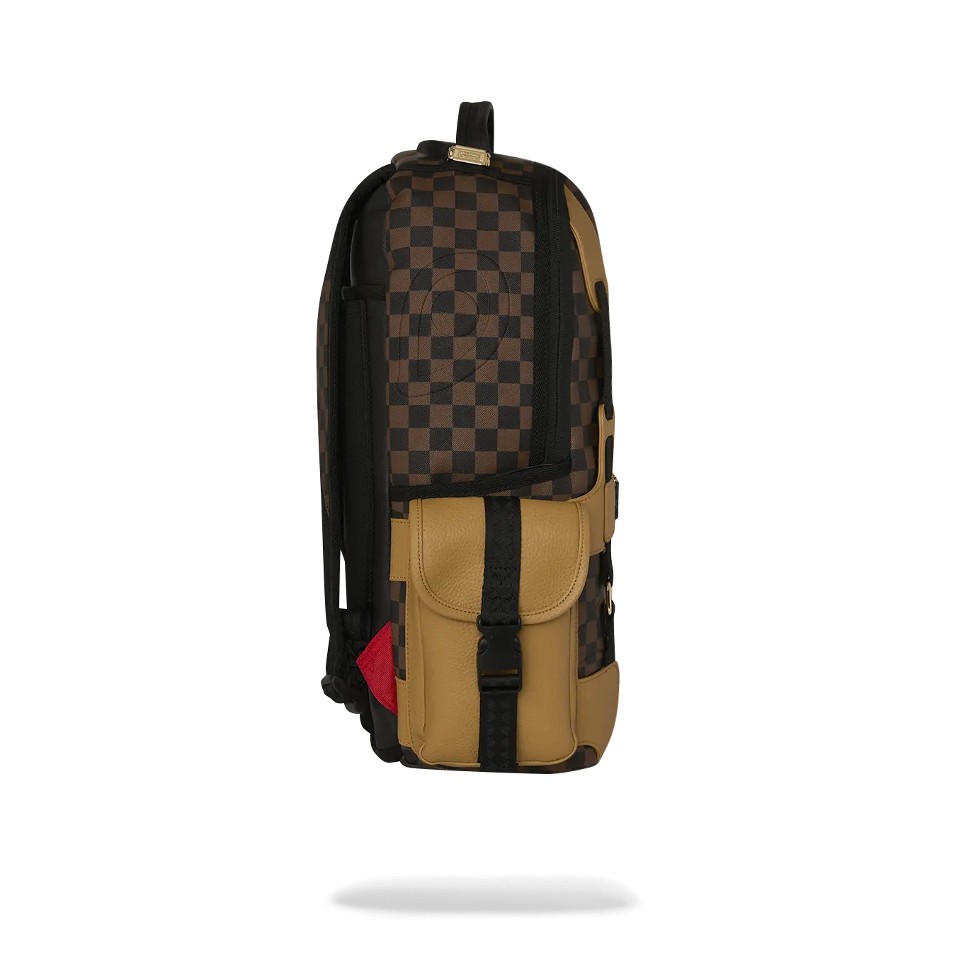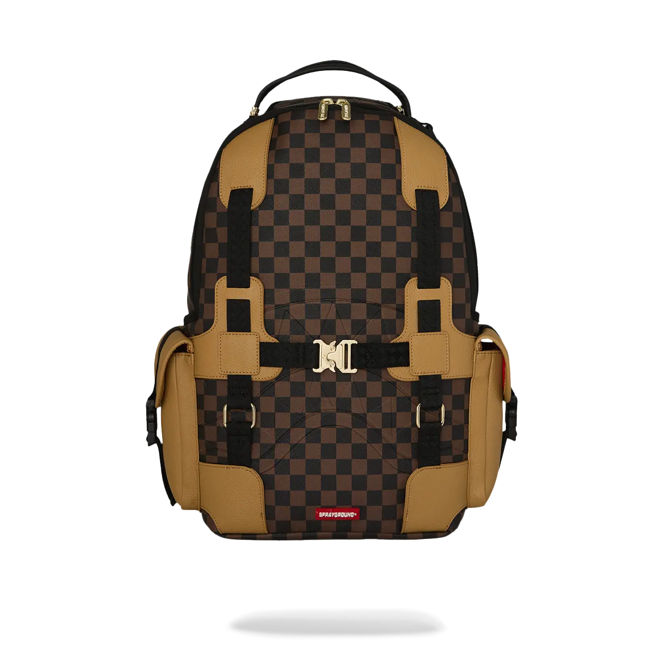 Dimensions: 18" x 6" x 11.5" • Front zipper pocket • Side pockets • Zippered Stash pocket • Separate velour sunglass compartment • Ergonomic mesh back padding • Adjustable Straps for custom sizing • Gold zippers with metal hardware • Metal "Sprayground Authentic" badge • Slide through back sleeve connects to carry-on luggage to free your hands