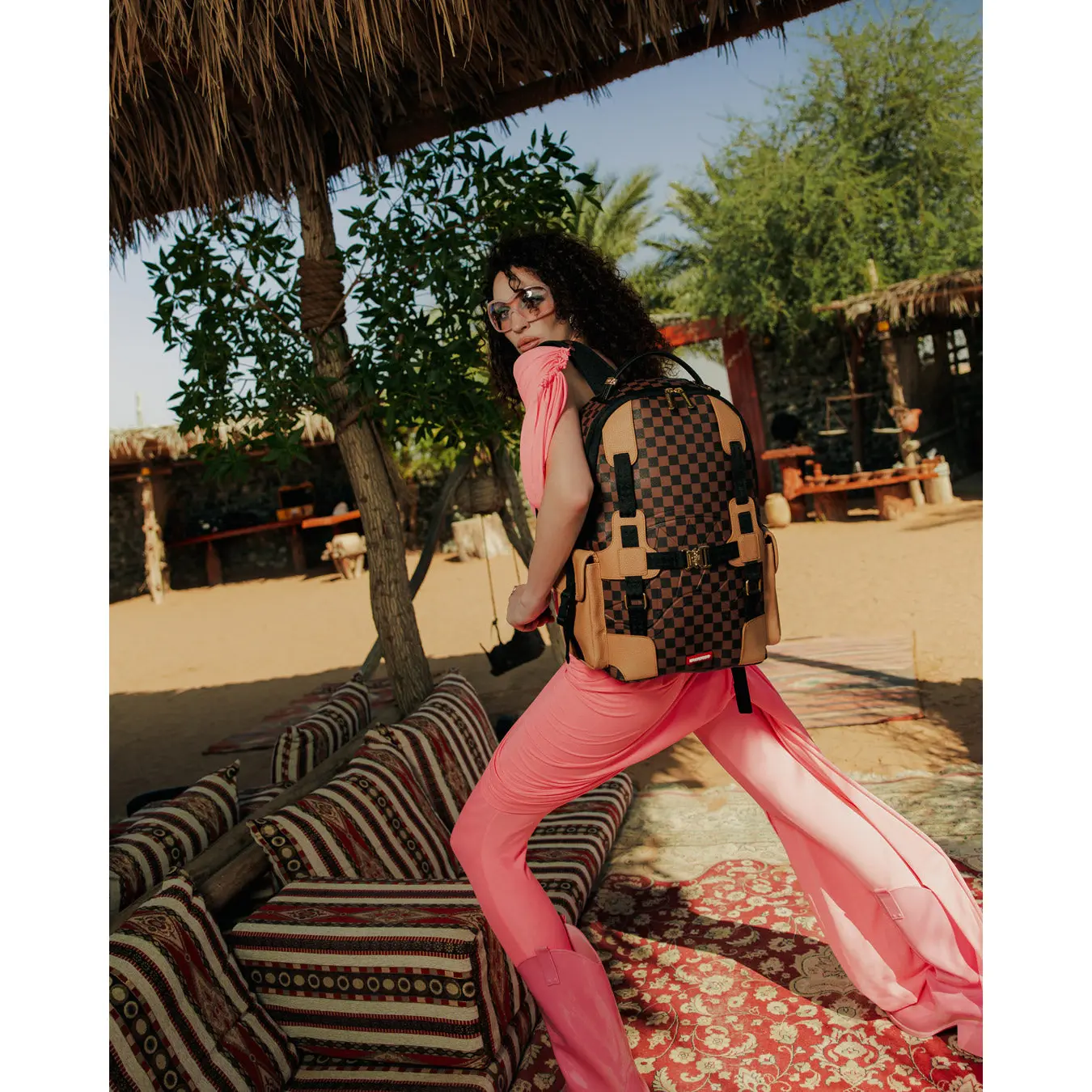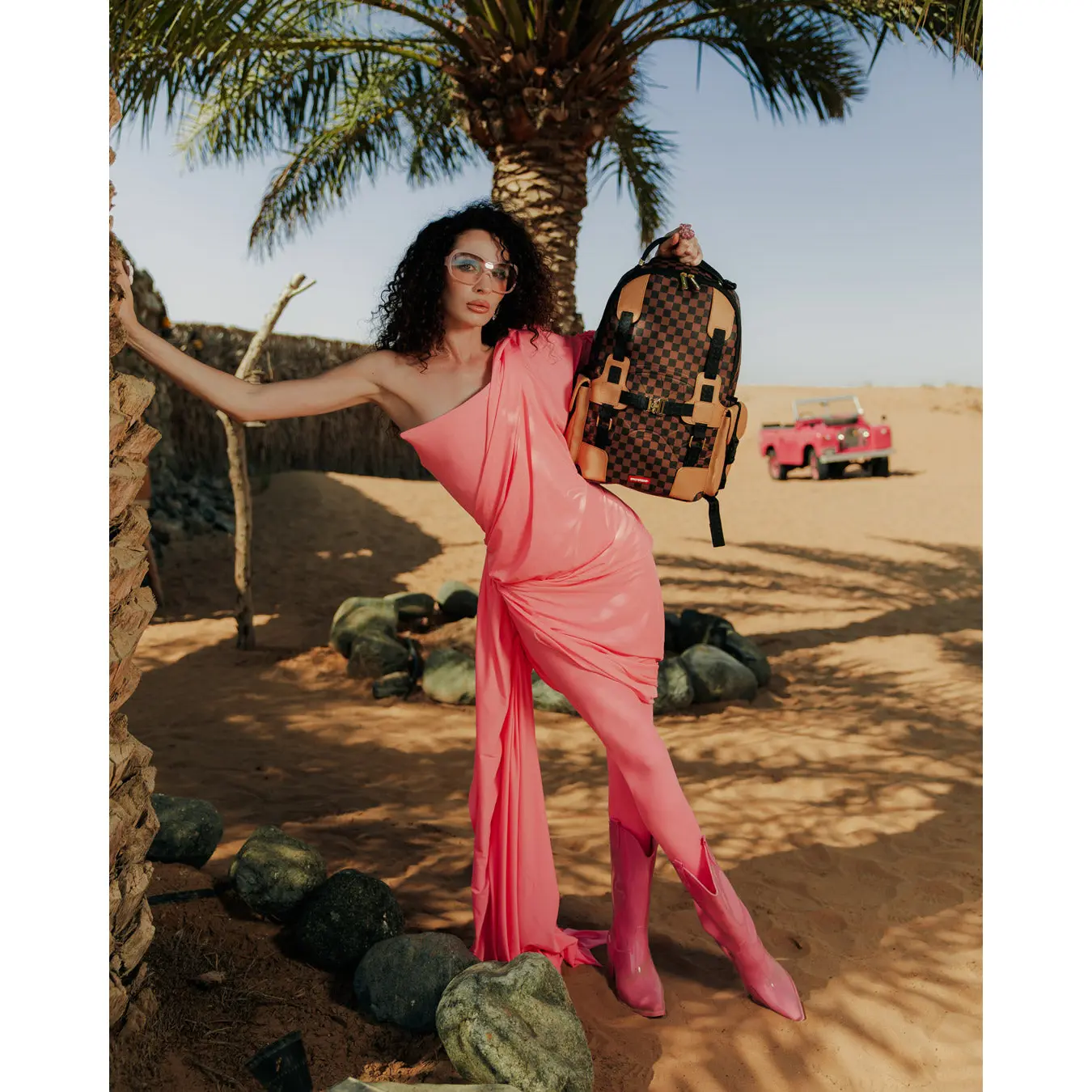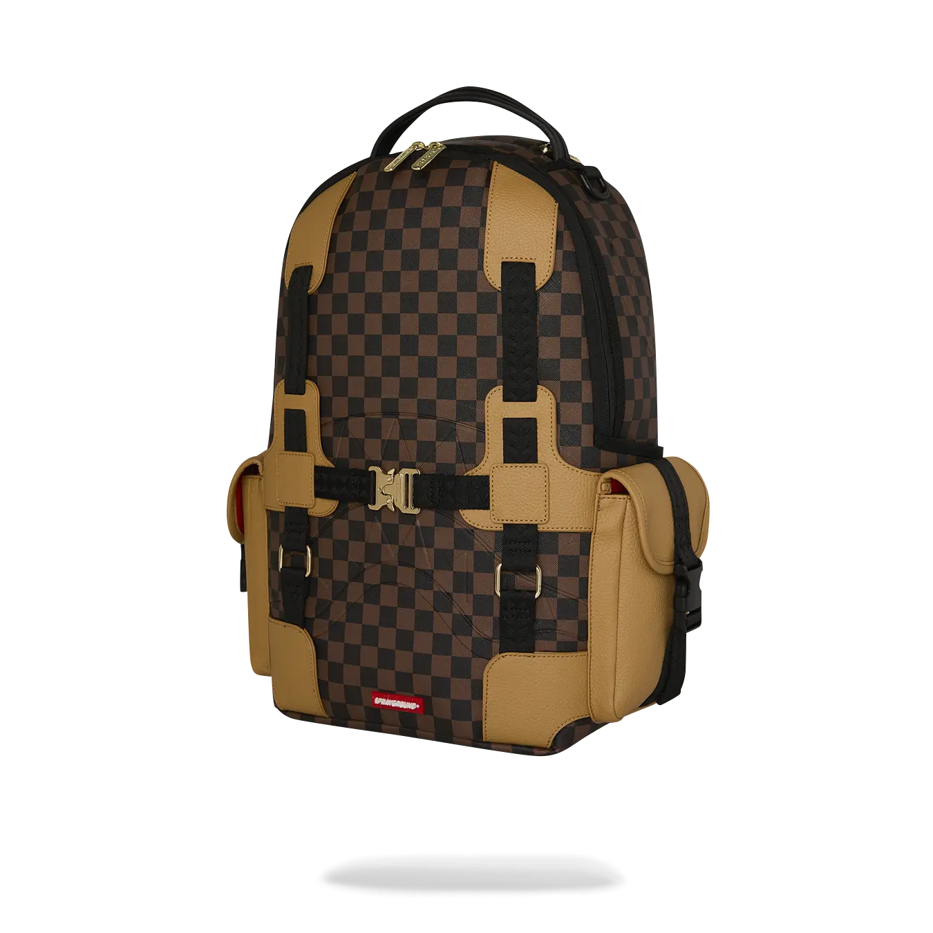 Dimensions: 18" x 6" x 11.5" • Front zipper pocket • Side pockets • Zippered Stash pocket • Separate velour sunglass compartment • Ergonomic mesh back padding • Adjustable Straps for custom sizing • Gold zippers with metal hardware • Metal "Sprayground Authentic" badge • Slide through back sleeve connects to carry-on luggage to free your hands