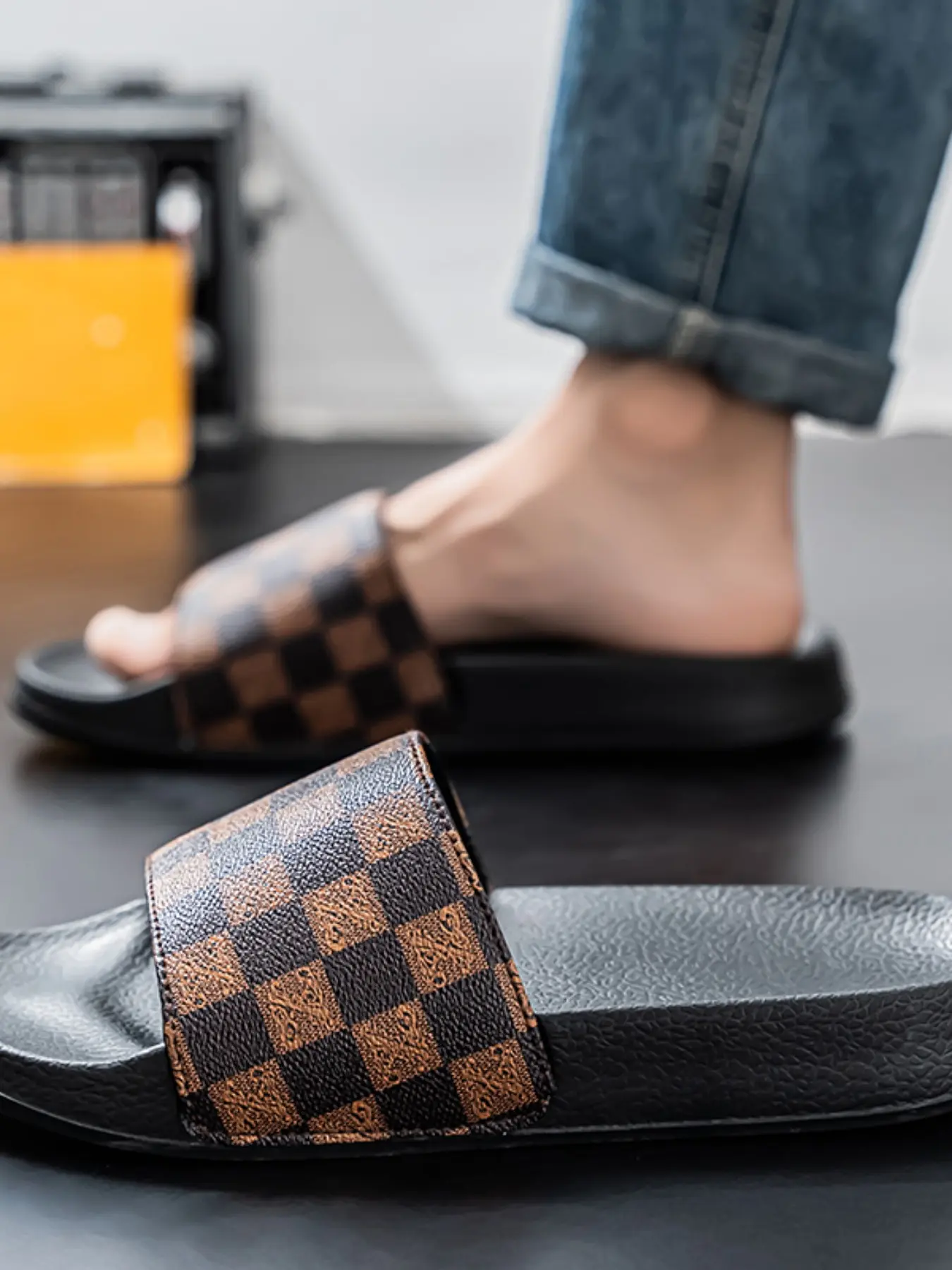 Men's Checkered Pattern EVA Slides, Casual Comfortable Non-slip Slippers, Open Toe Shoes for Indoor Outdoor Beach Shower