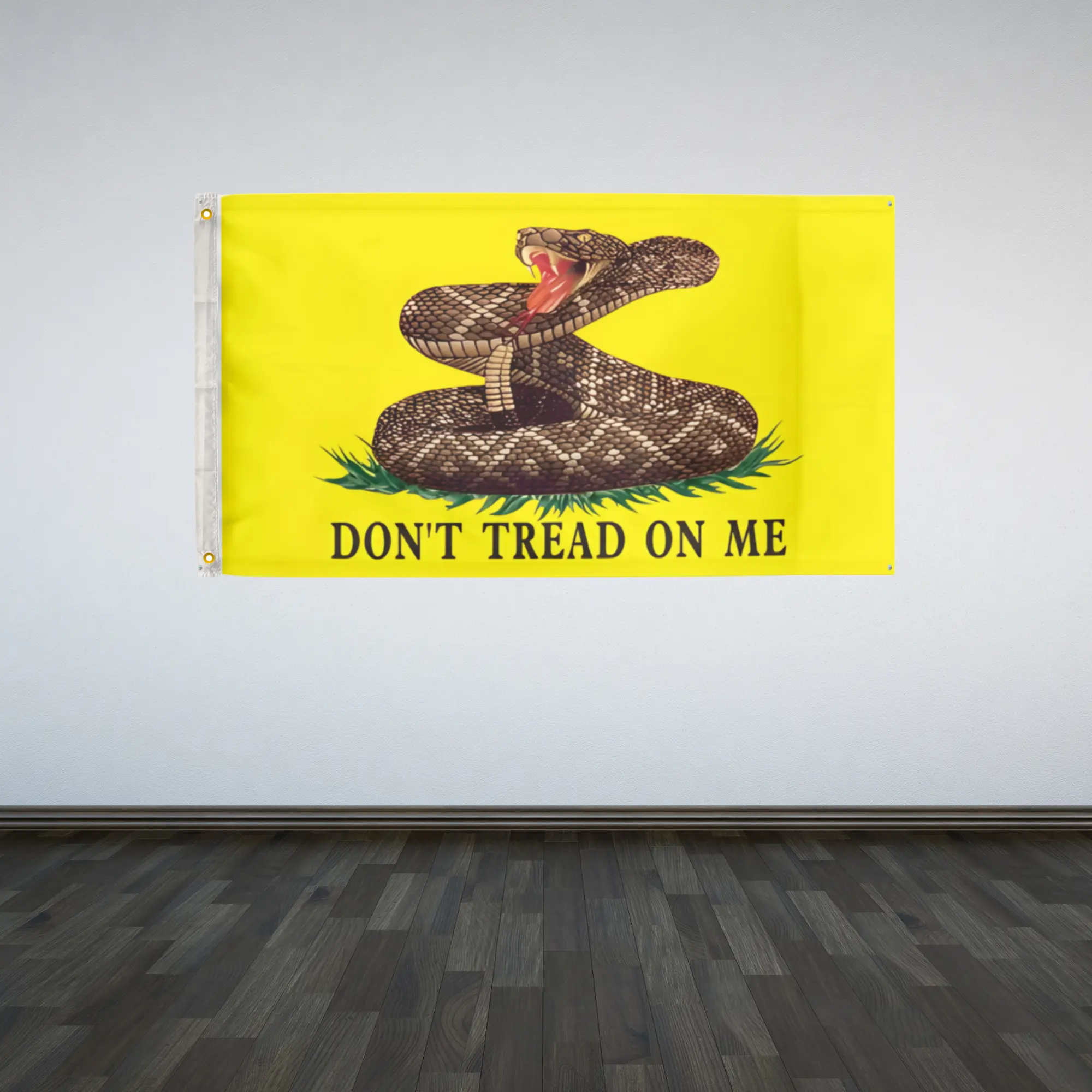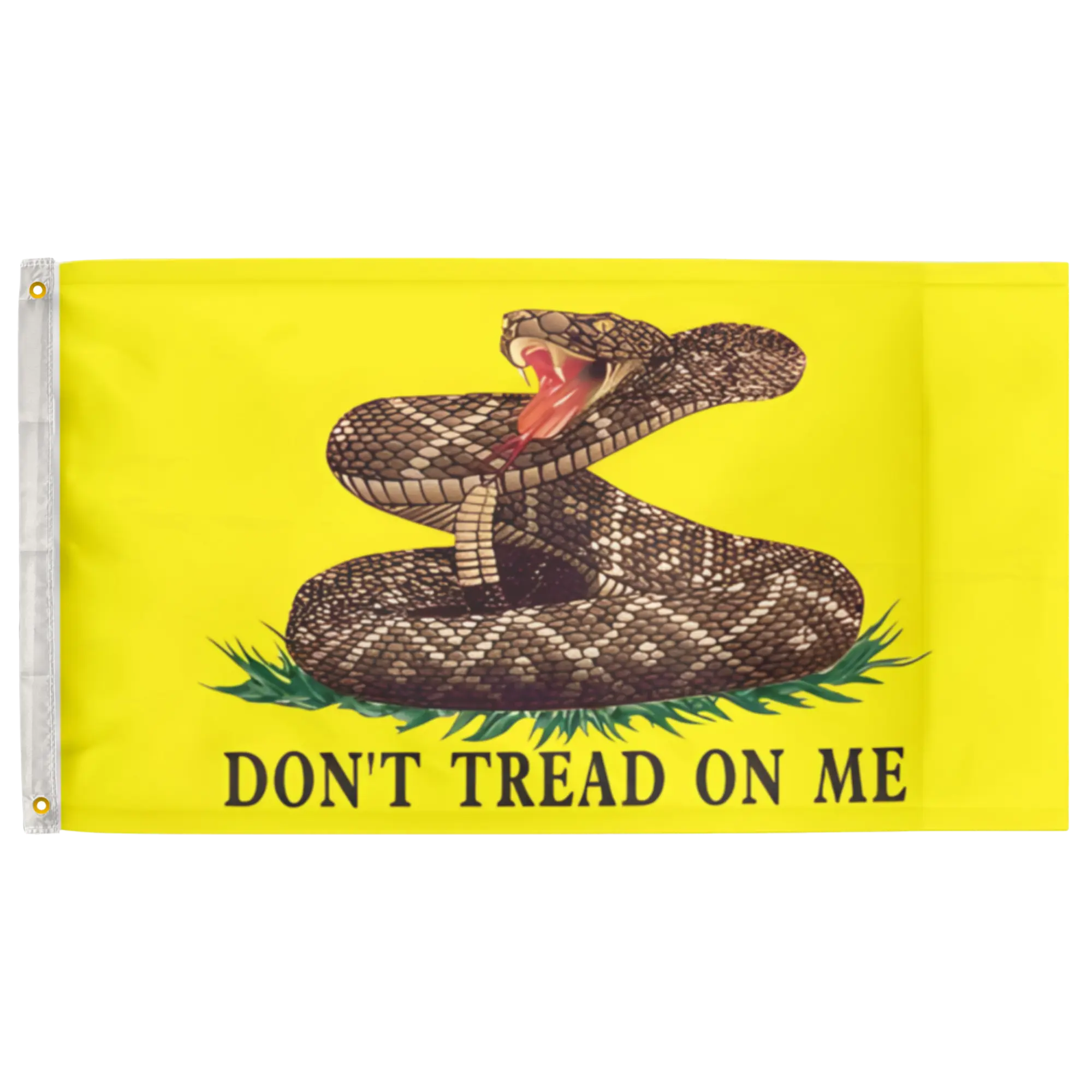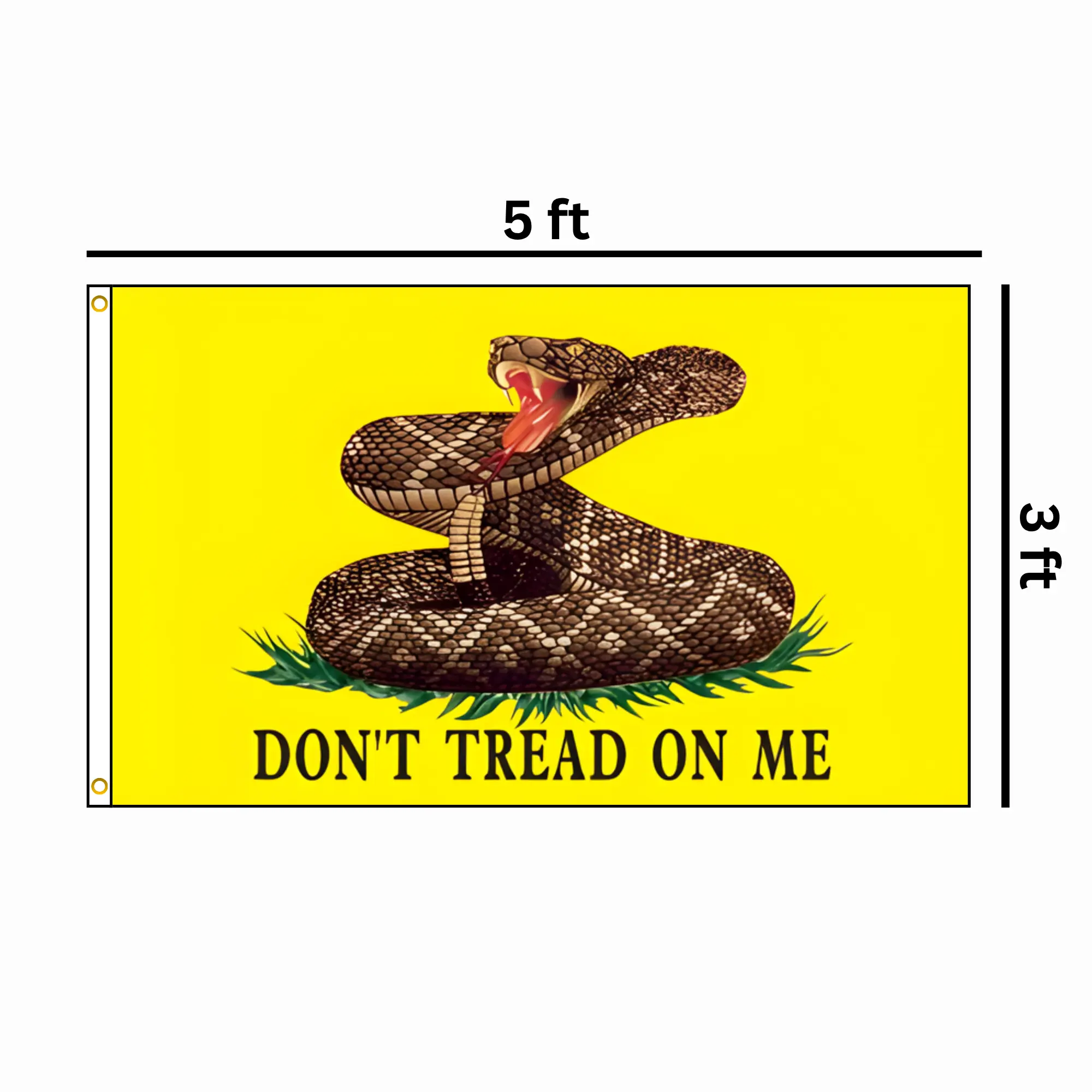 The Gadsden Rattle Snake 3'x5' Gadsden Don't Tread On Me Flag is a traditional and patriotic flag designed for outdoor display. Made of 100% polyester material, this multicolor flag features a Gadsden Flag subject and is waterproof for durable use. With a size of 3 x 5 ft, it is easy to hang from a flagpole and is ideal for showing support for the history of the United States in a yard, garden, or outdoor living space. It is a stylish and eye-catching addition to any home or garden décor.