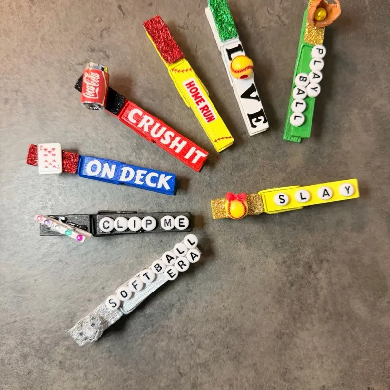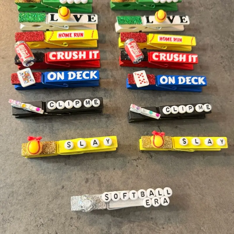 Give out these cute softball 🥎 mixed sports spirit pins/ clips at your next tournament or game. They're also great for pinning or clipping backpacks during volleyball, basketball, softball, soccer, gymnastics, track, cheer, and volleyball. Pin sayings include- CLIP ME, SLAY, PLAY BALL and more!