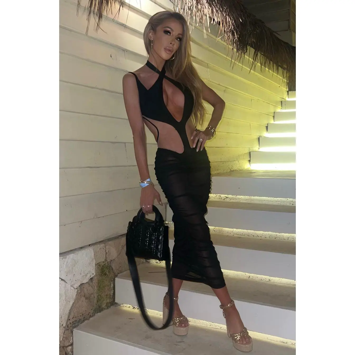 Look like a celebrity in this body accentuating fantasy fit! This midi dress features cut out detailing on the torso, chest, and shoulders, a mesh ruched skirt, and a underliner like a bodysuit. Whether it's with pumps and a leather jacket for a night at the club or worn as lingerie for a special someone, we're absolutely loving it!