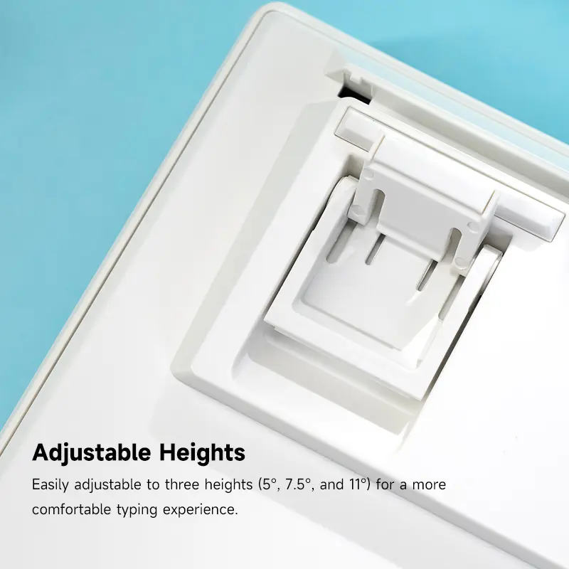 The keyboard has three adjustable heights (around 5°, 7.5°, 11°) so you can find a comfortable typing angle.