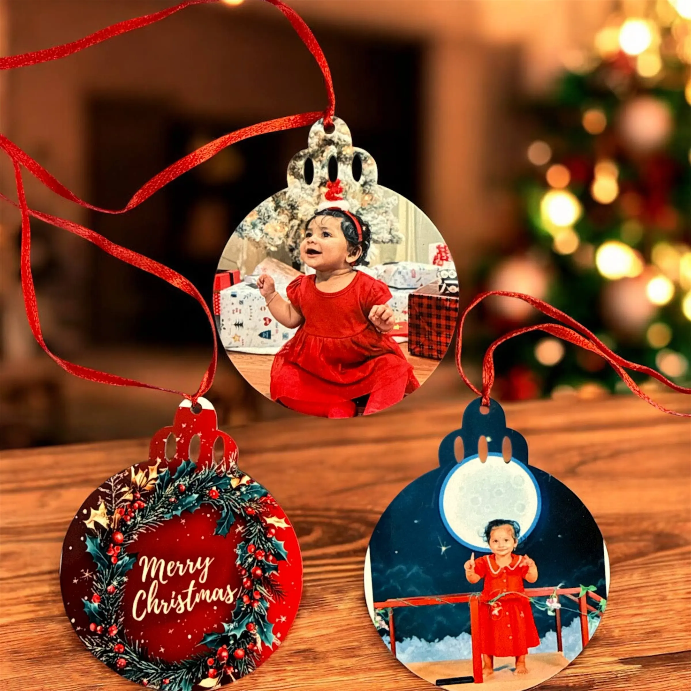 Choose Same Photo Both Sides for a classic look, or Different Photos Each Side to pack in twice the memories. Each ornament arrives with a ribbon for hanging, ready to gift or display.