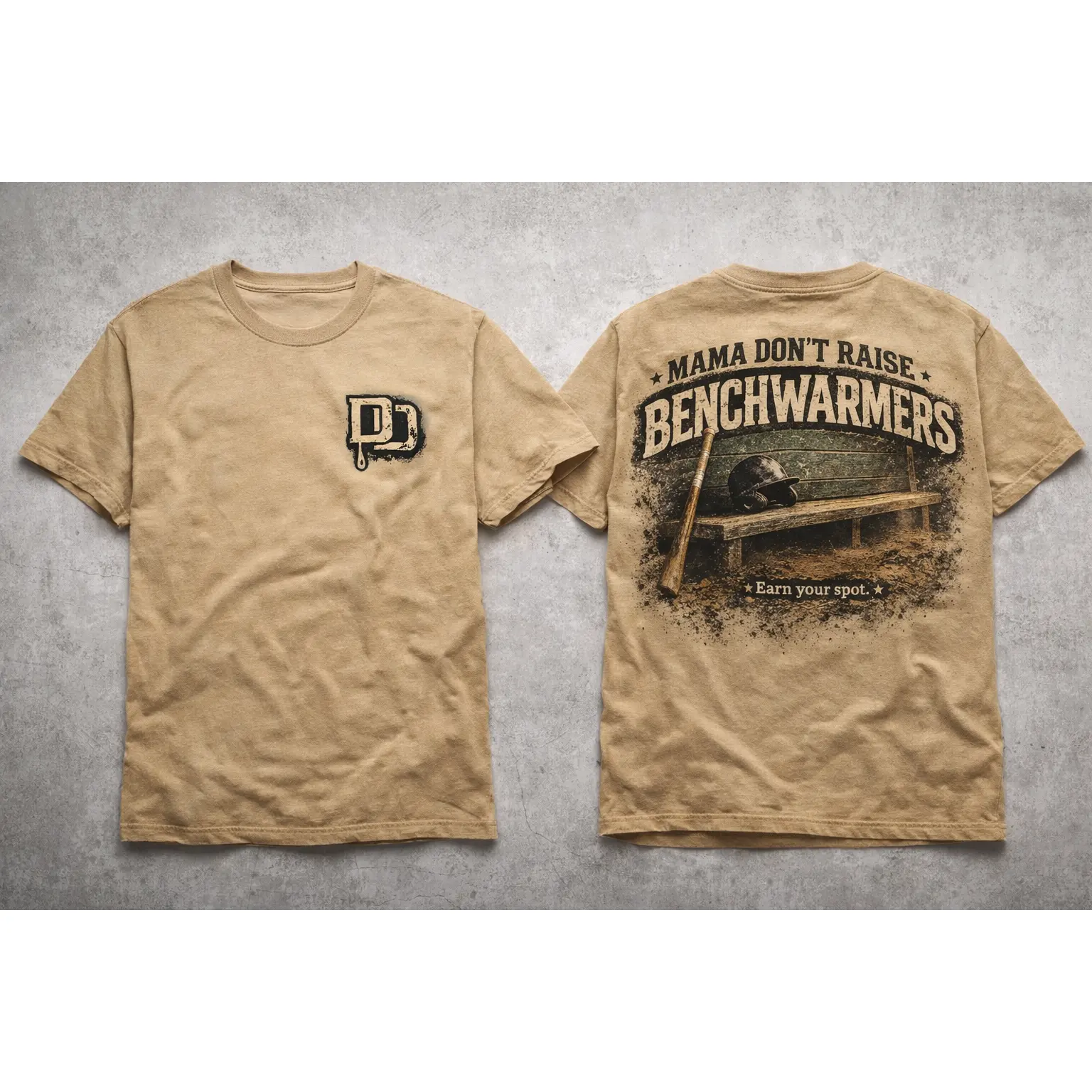 The Benchwarmers Tee is built for the ones who put in the work — early mornings, late innings, and everything in between. Featuring a bold back graphic with the phrase "Mama Don't Raise Benchwarmers" over a vintage dugout scene, this tee speaks the language of every player who's ever grinded for their spot.