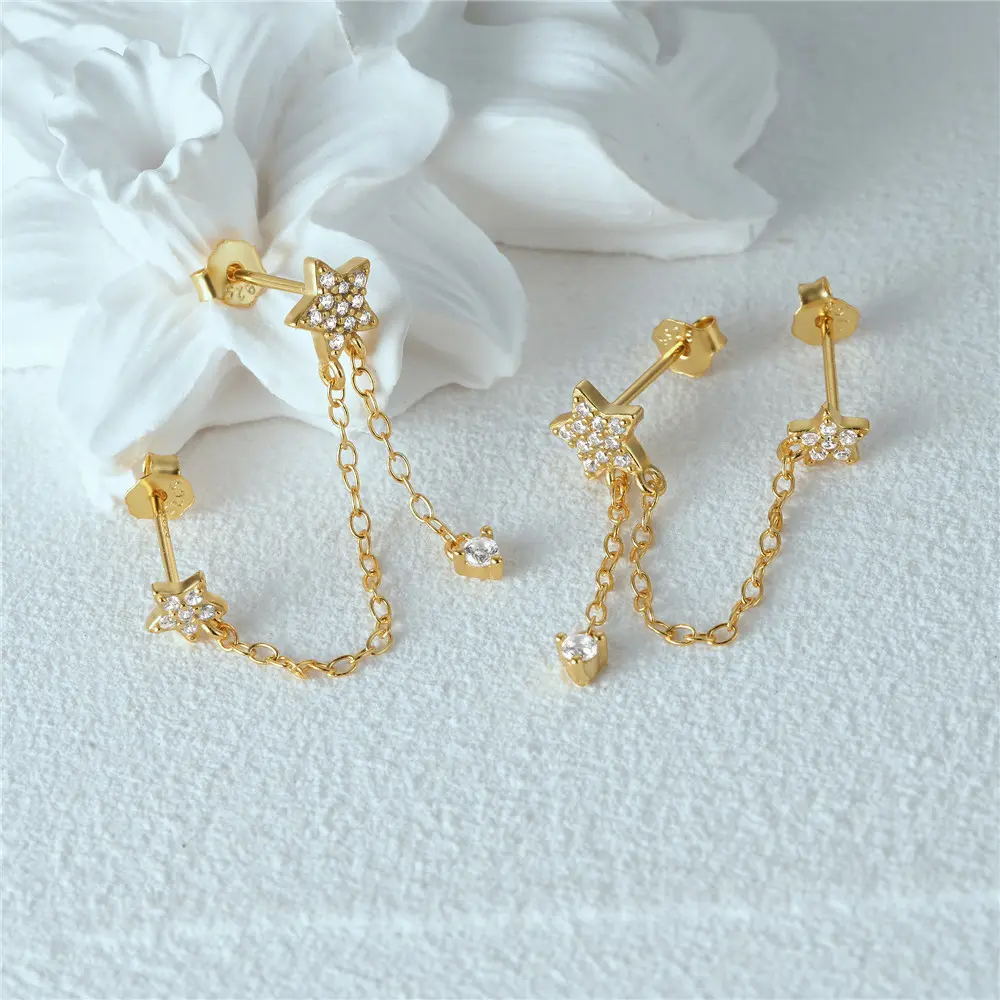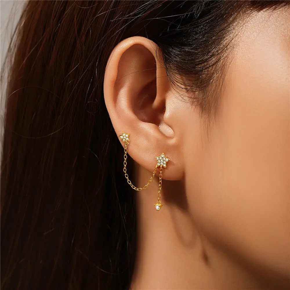 PAVOI 14K Gold Chain Earrings for Women | Double Piercing Dangle Chain Huggie Hoop Earrings | Cubic Zirconia Star Stud Ear Cuff Earrings for Women