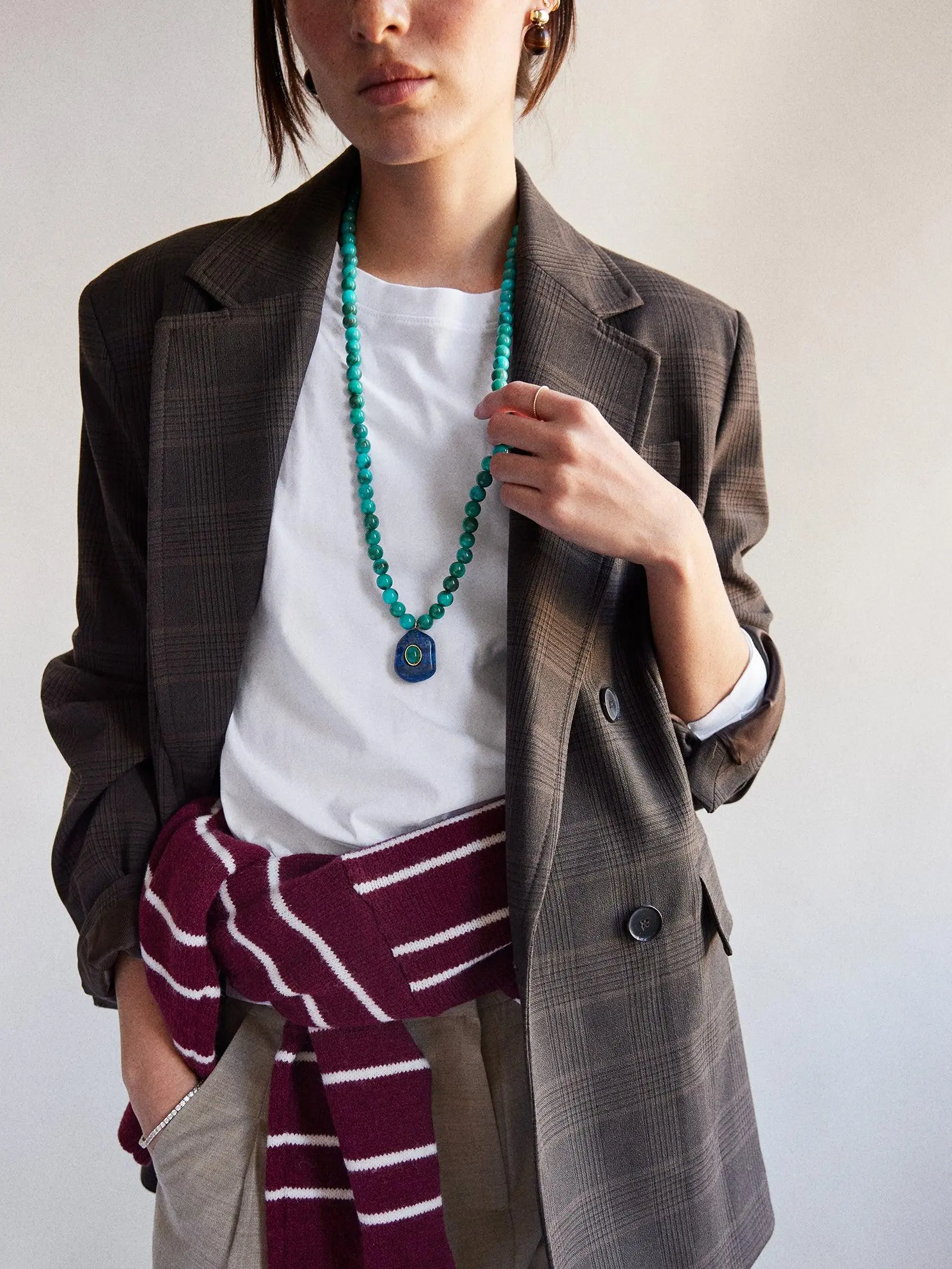 Need a little color? This one’s got you. With glossy semi-precious beads and a bold pendant, it’s an easy way to wake up your layers.