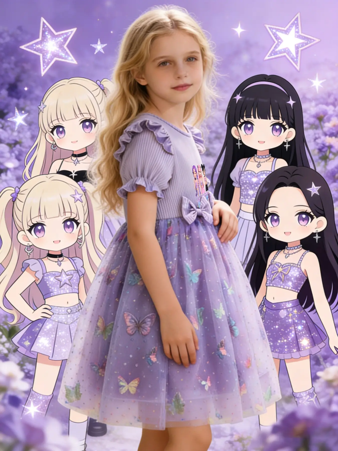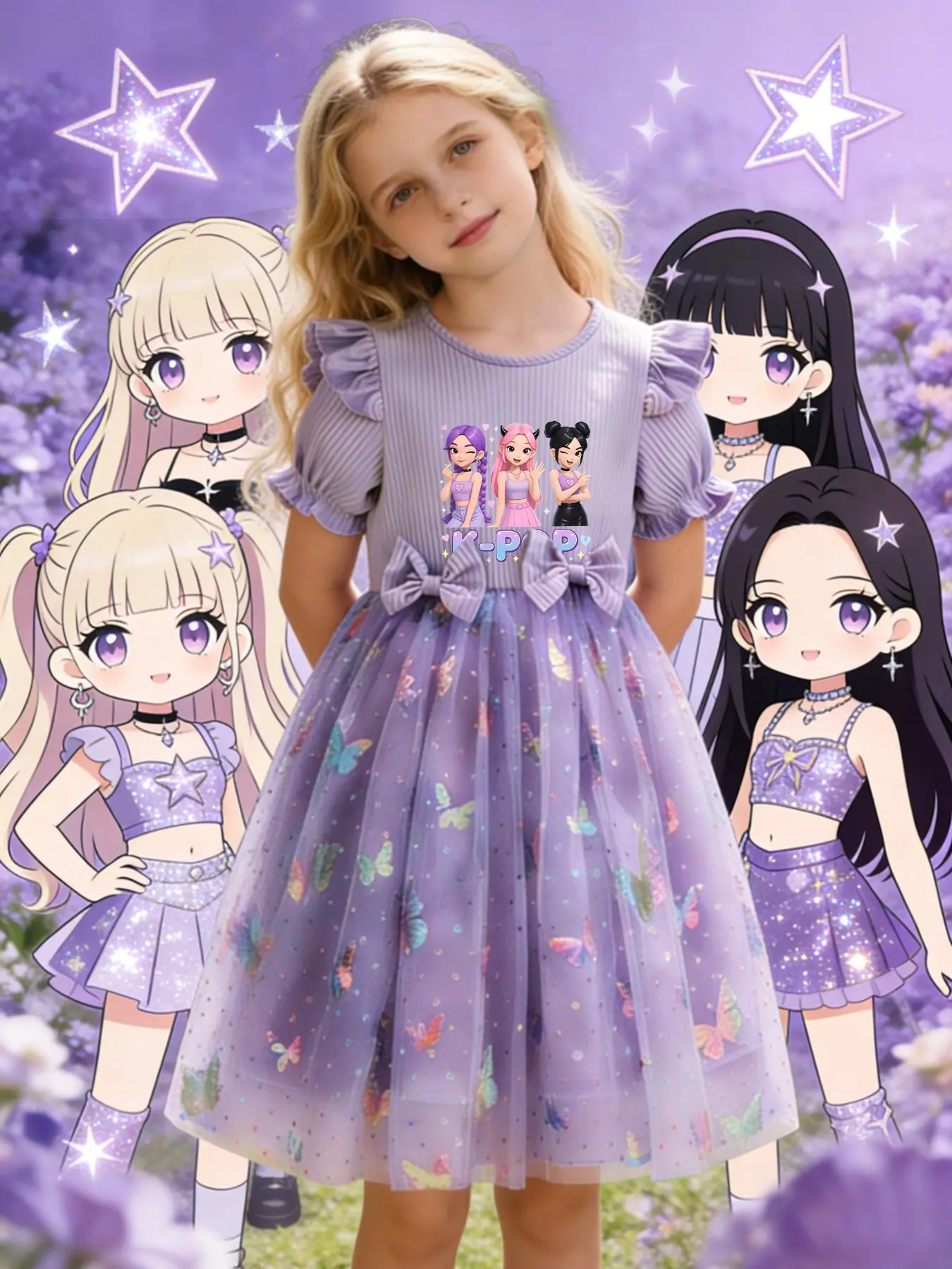 Princess Party Dance Dress, Butterfly Mesh Skirt, Dreamy Elegant Design, K-Pop Girl Group Print, Perfect for Camping Travel Parties