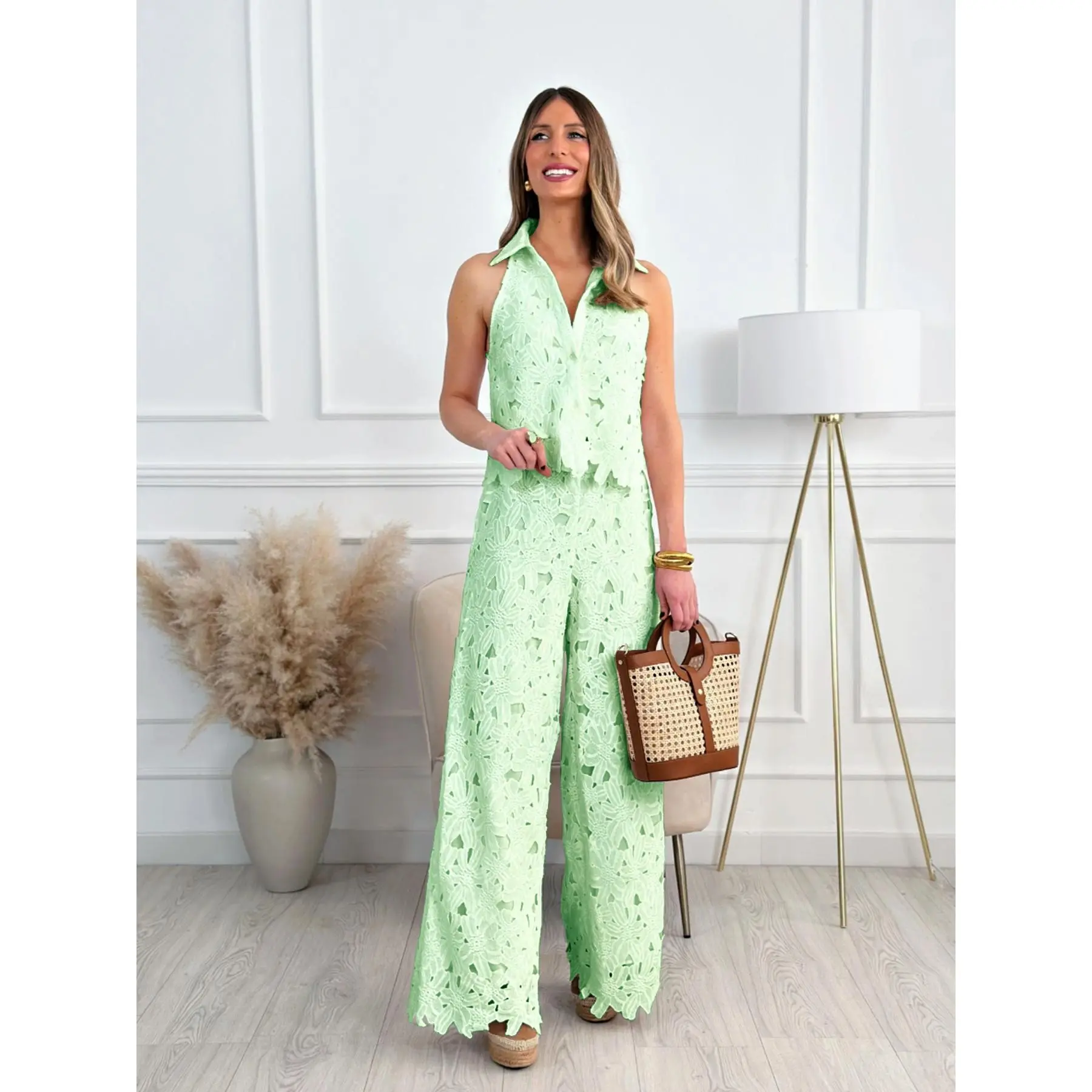 ✨ The V-neck vest top and wide-leg trousers offer a versatile look. The embroidery and hollow details enhance the outfit's appeal. Suitable for various events, this two-piece set is a must-have for your wardrobe. Elevate your style with this retro-inspired outfit, designed for both casual and special occasions.