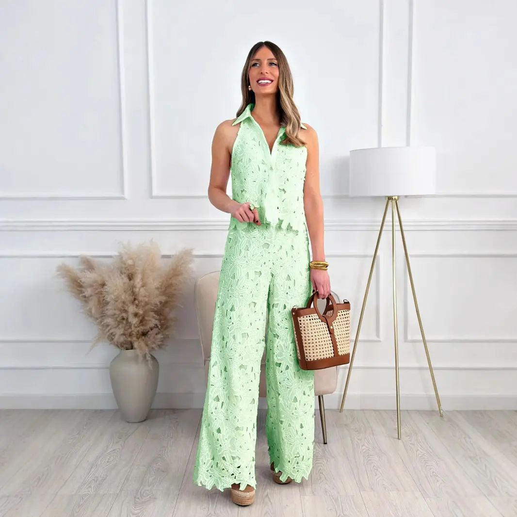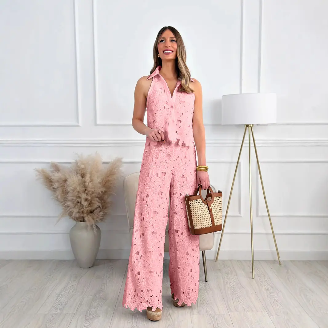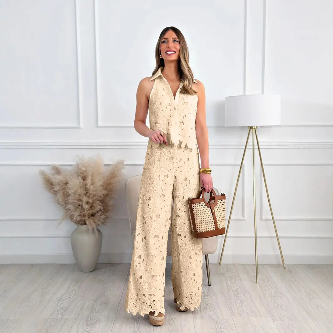 ✨ Discover the Women's 2026 New Retro Lace Outfit Set. This ensemble includes a V-neck vest top and wide-leg straight-cut trousers. Perfect for casual and special occasions, it combines elegance with comfort. The set features embroidery and hollow designs, adding a unique temperament. Ideal for those who appreciate retro fashion.