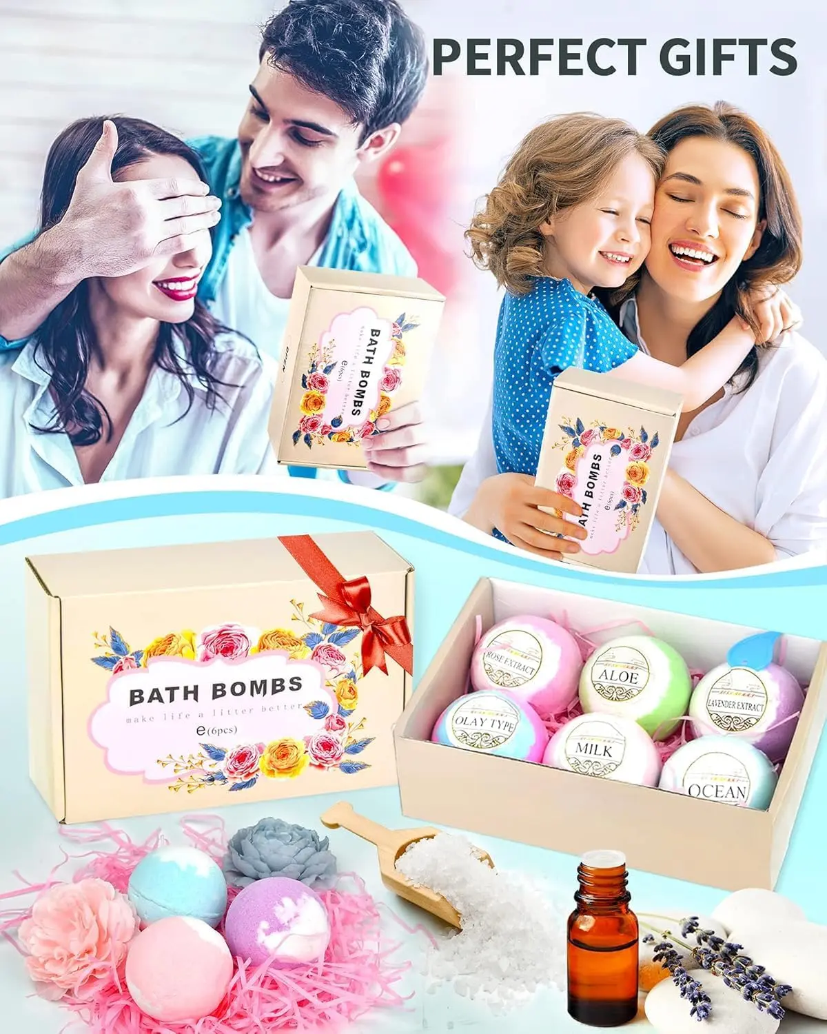 ·PERFECT BATH BOMBS GIFT SET. 6 PACK bath bombs, 4.23 oz each features unique scents, LAVENDER, ALOEM, OCEAN(OLAYER), ROSE, MILK, SLEEP(JASMINE), experience with a natural colorful bath. Surprise your family, lover, and friends with an exquisite bath bomb gift set on Christmas, Birthday, Valentine's Day, Mother's Day, Wedding, Anniversary. Each bath bomb is individually wrapped to preserve freshness and quality for the best possible experience.No coloring will stain the skin nor tub. PS: come with an opener.