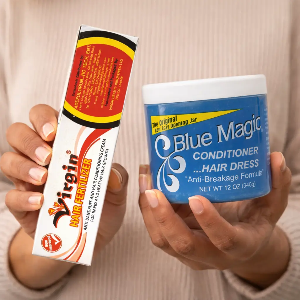 Why This Combo Works: Virgin Hair Fertilizer nourishes the scalp and stimulates follicles, while Blue Magic seals in moisture and prevents breakage. Together they target growth AND retention — because growing hair means nothing if it's breaking off.