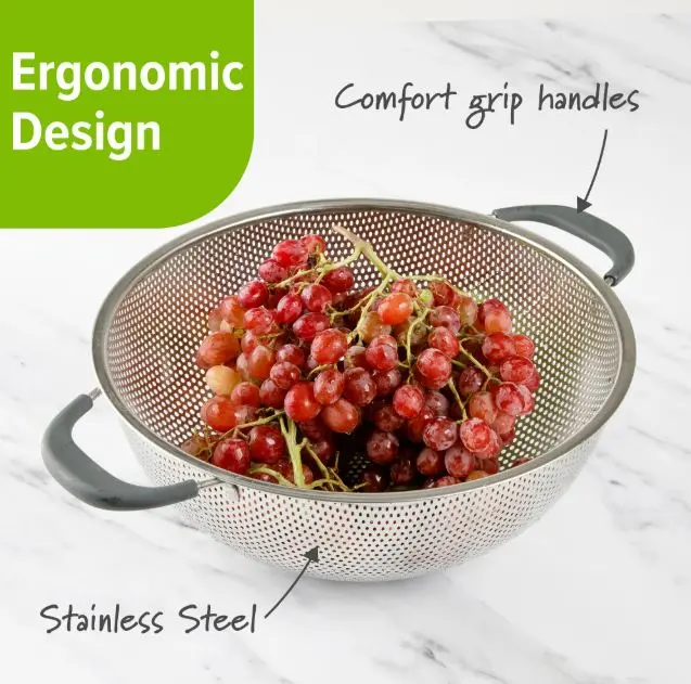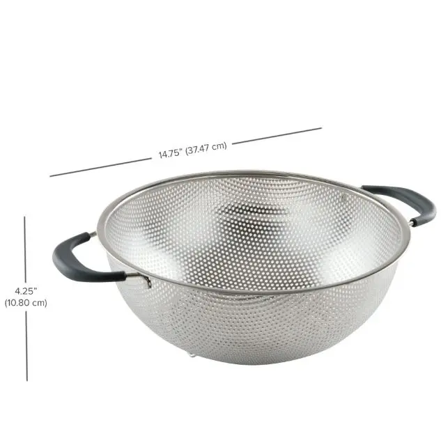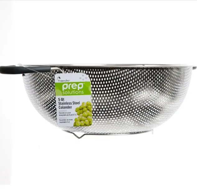 PrepSolutions 5 Quart Stainless Steel Colander features durable perforated stainless steel construction. Soft grip handles provide comfort and control. Footed base offers elevation and stability. Precision sized holes prevent small foods from passing through while allowing quick liquid drainage. Perfect for draining pasta fruits vegetables and more. Dishwasher safe for easy cleaning. Elegant design adds a stylish touch to any kitchen.