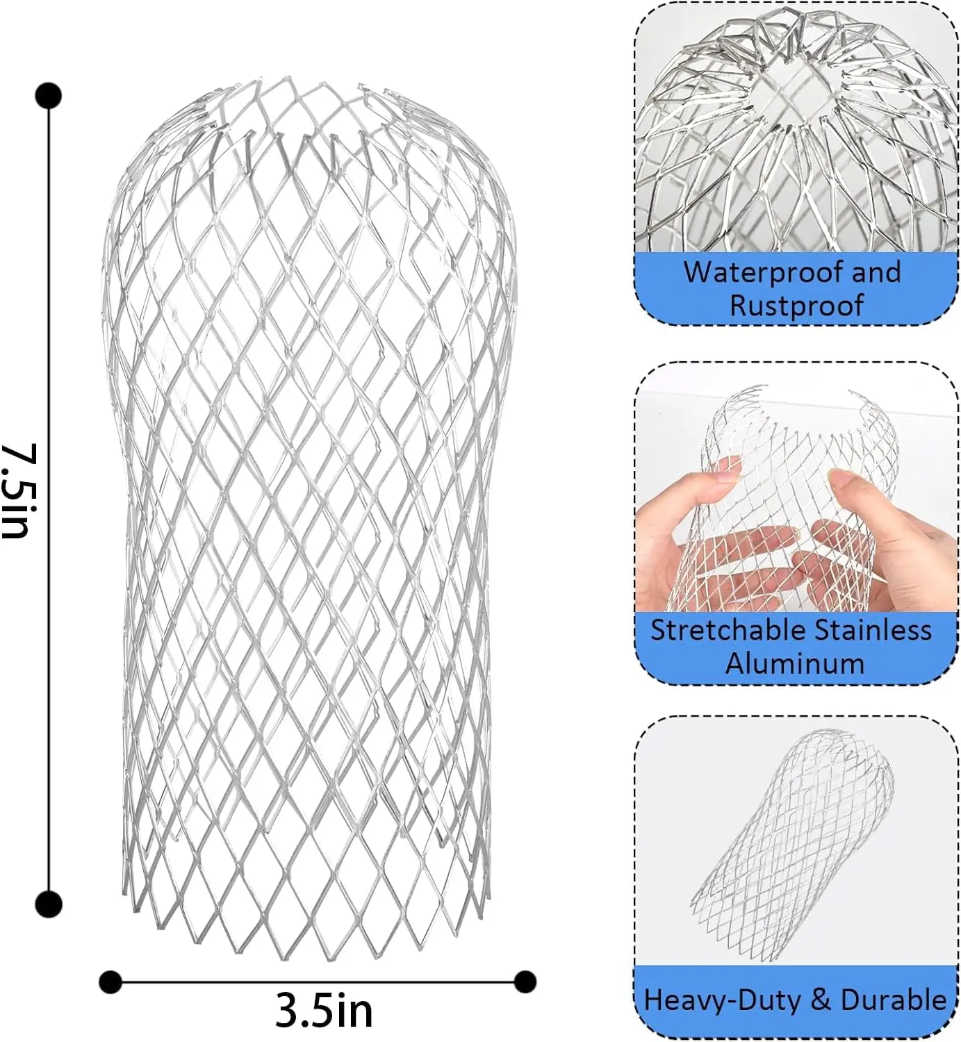 ·Expandable Mesh Leaf Filter: Expandable Mesh Leaf Filter: Width: 3.5in (8.9cm), Height: 7.5in (19cm), Easily bends to fit the size of the gutter system (round, oval, square, or rectangular) and fits most 2-3.5in (5.1-8.9cm) diameter downspouts perfectly.