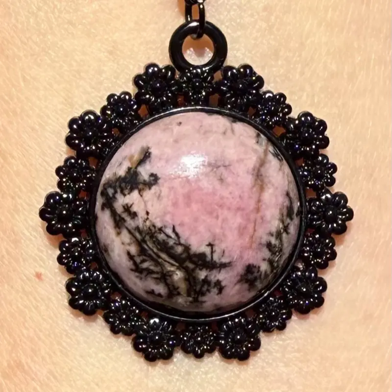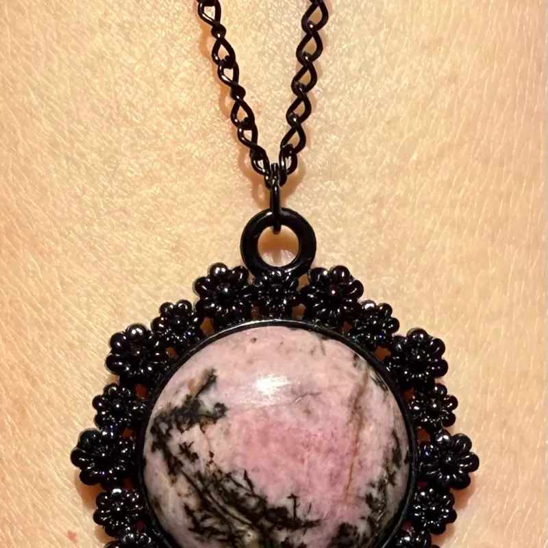 Rhodonite Necklace on 18 inch black hypoallergenic stainless steel chain