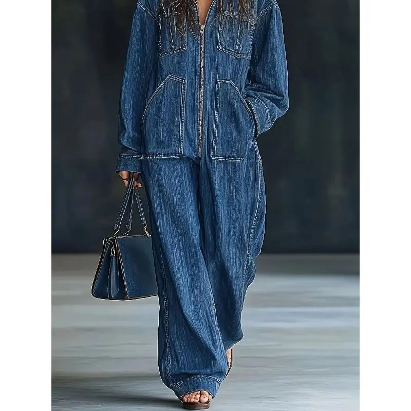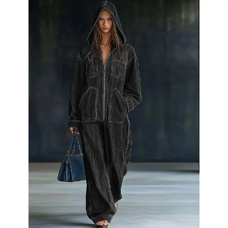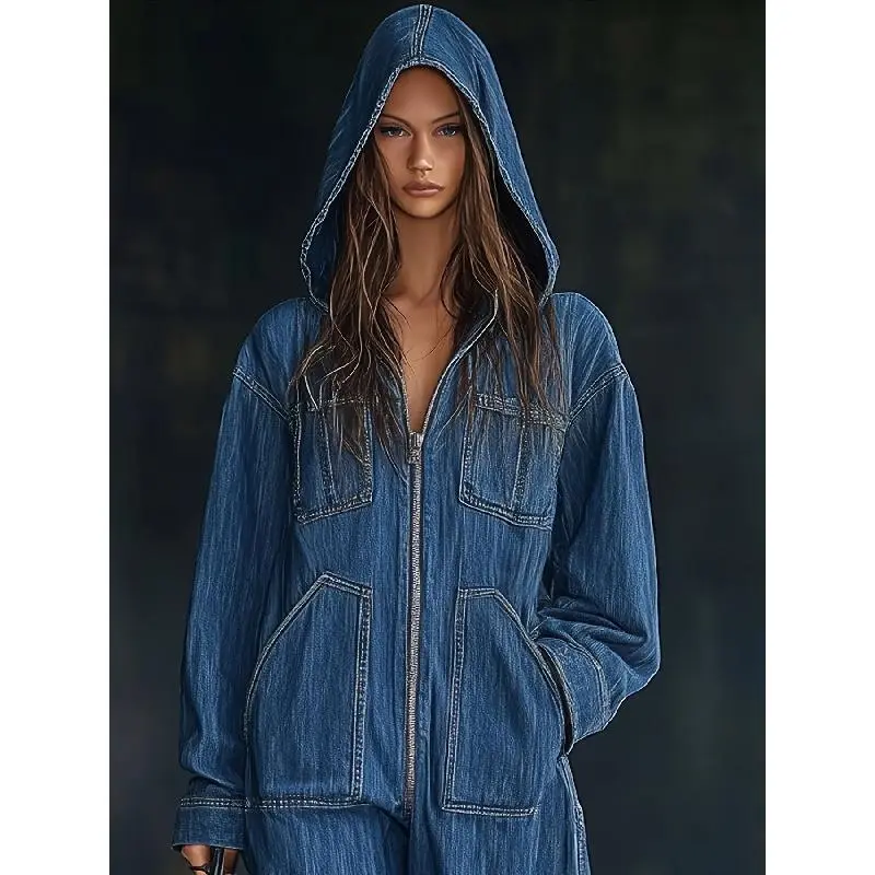 Autumn and Winter New European and American Hooded Jumpsuit Denim Women's Clothing, Spring New American High Street Pants, Lazy Casual Style