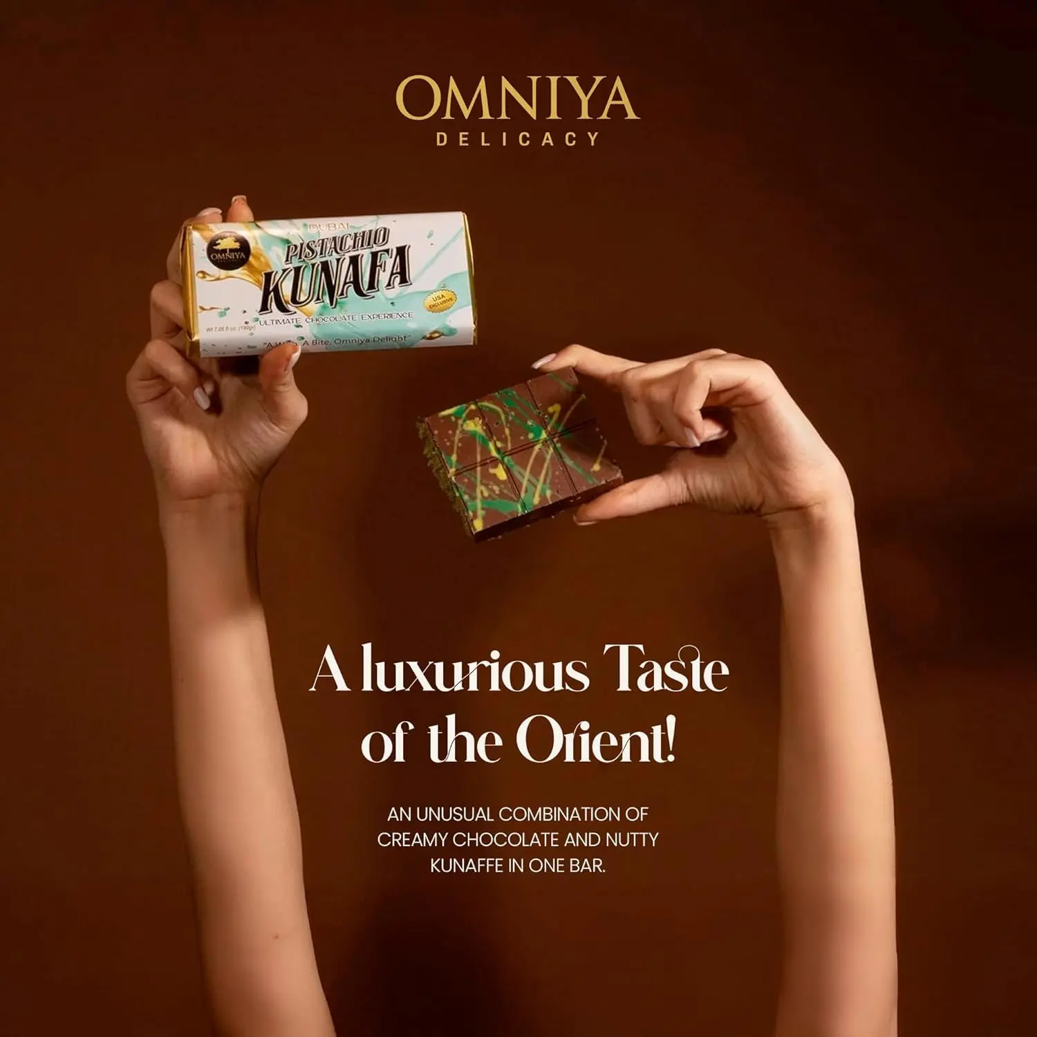 Get ready to indulge in the most talked-about dessert sensation! Omniya’s Dubai Milk Chocolate Pistachio Kunafa Bar is a luxurious blend of crispy kunafa layers, rich pistachio cream, and silky smooth Belgian milk chocolate. Each bite delivers the perfect balance of texture and flavor — crunchy, creamy, nutty, and irresistibly sweet.
